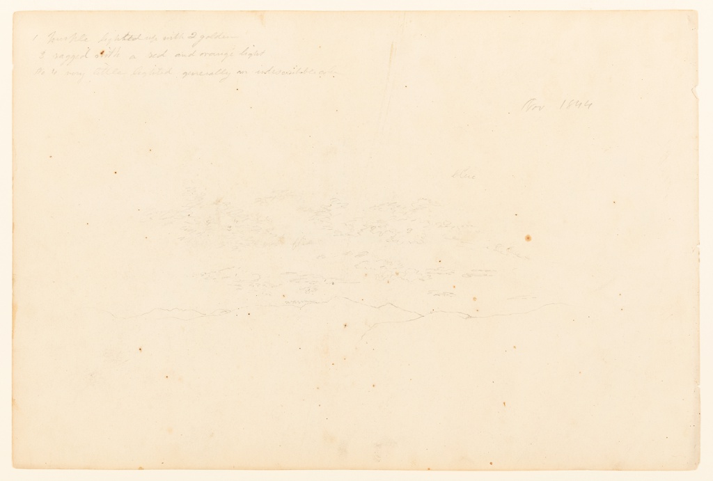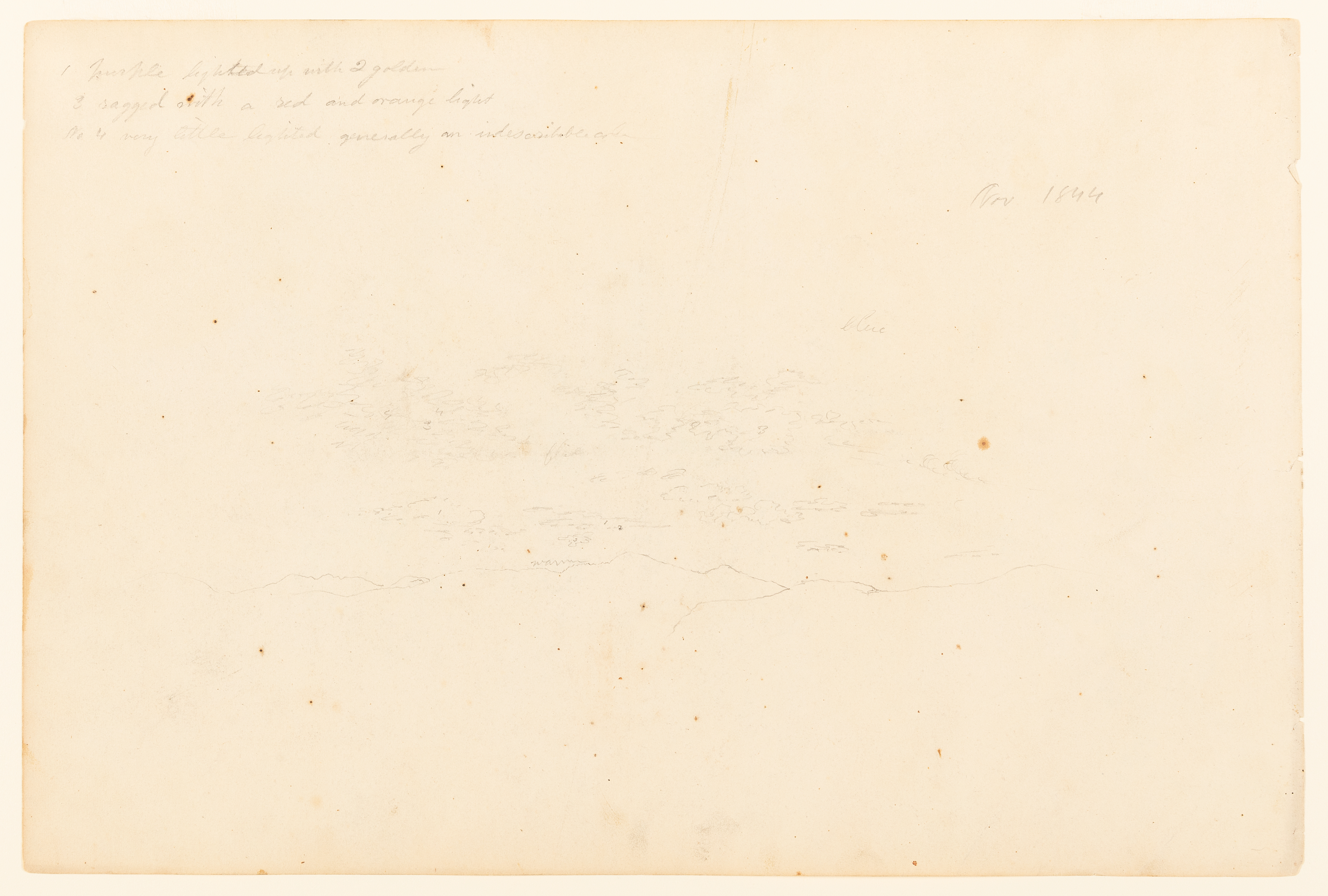 Inscribed: in graphite, upper left: 1 purple lighted up with 2 golden / 3 ragged with a red and orange light / No. 4 very little lighted generally an indescribable color; in graphite, upper right: Nov 1844; in graphite, center: blue / 4 4 / 3 3 / blue / 1 / 2 / 2 / warm; in graphite, verso lower right: July 1844
