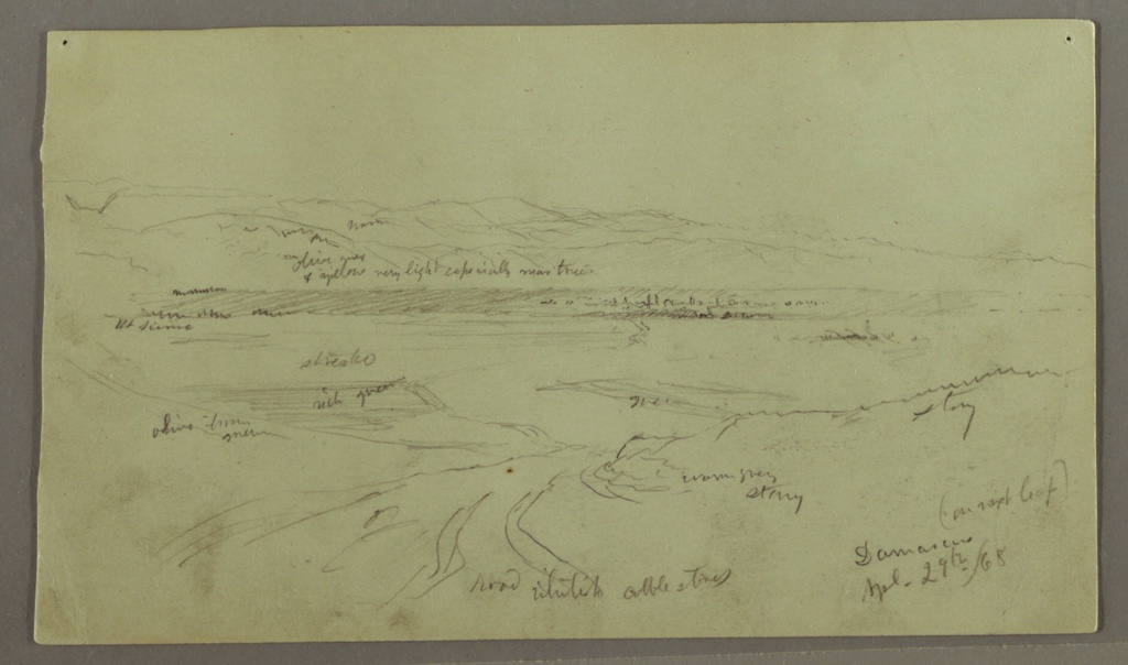 Inscribed: in graphite, center: warm / olive green / & yellow very light especially near trees; in graphite, center left: Bt. sienna / Streaks / rich green / olive - brown / green; in graphite, center right: green / stony / warm grey / stony; in graphite, lower center: road whitish cobble stones; in graphite, lower right: (on next leaf) / Damascus / Apl. 29th /68; in graphite, verso center: white / Brown; in graphite, verso lower right: House on Canal Bank Damascus / May 2d /68