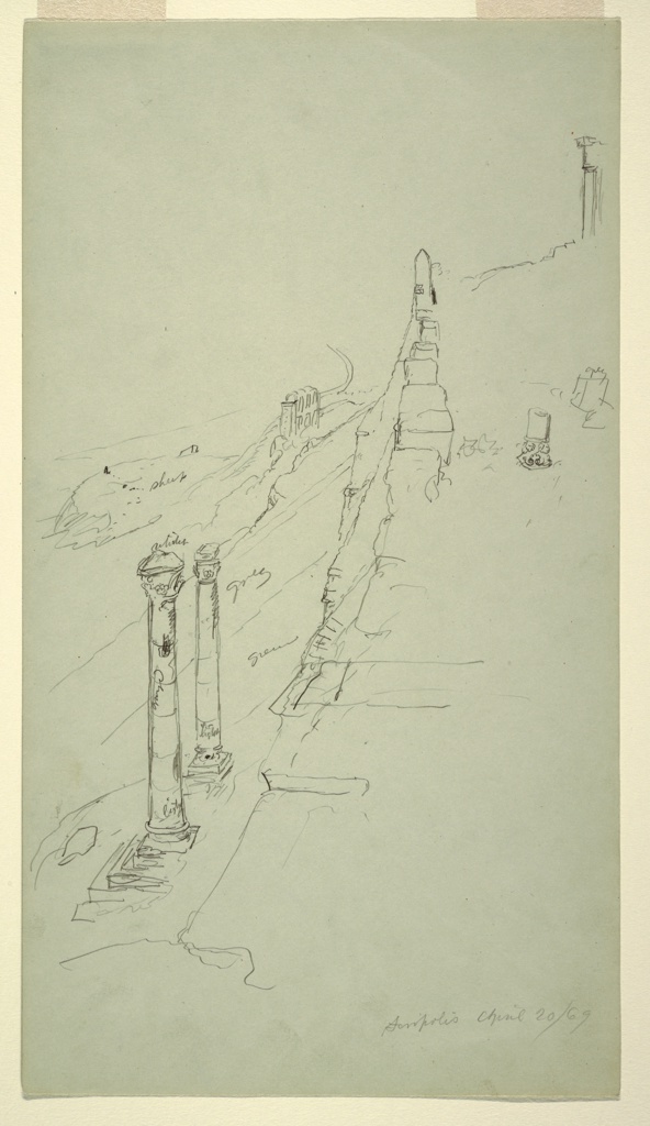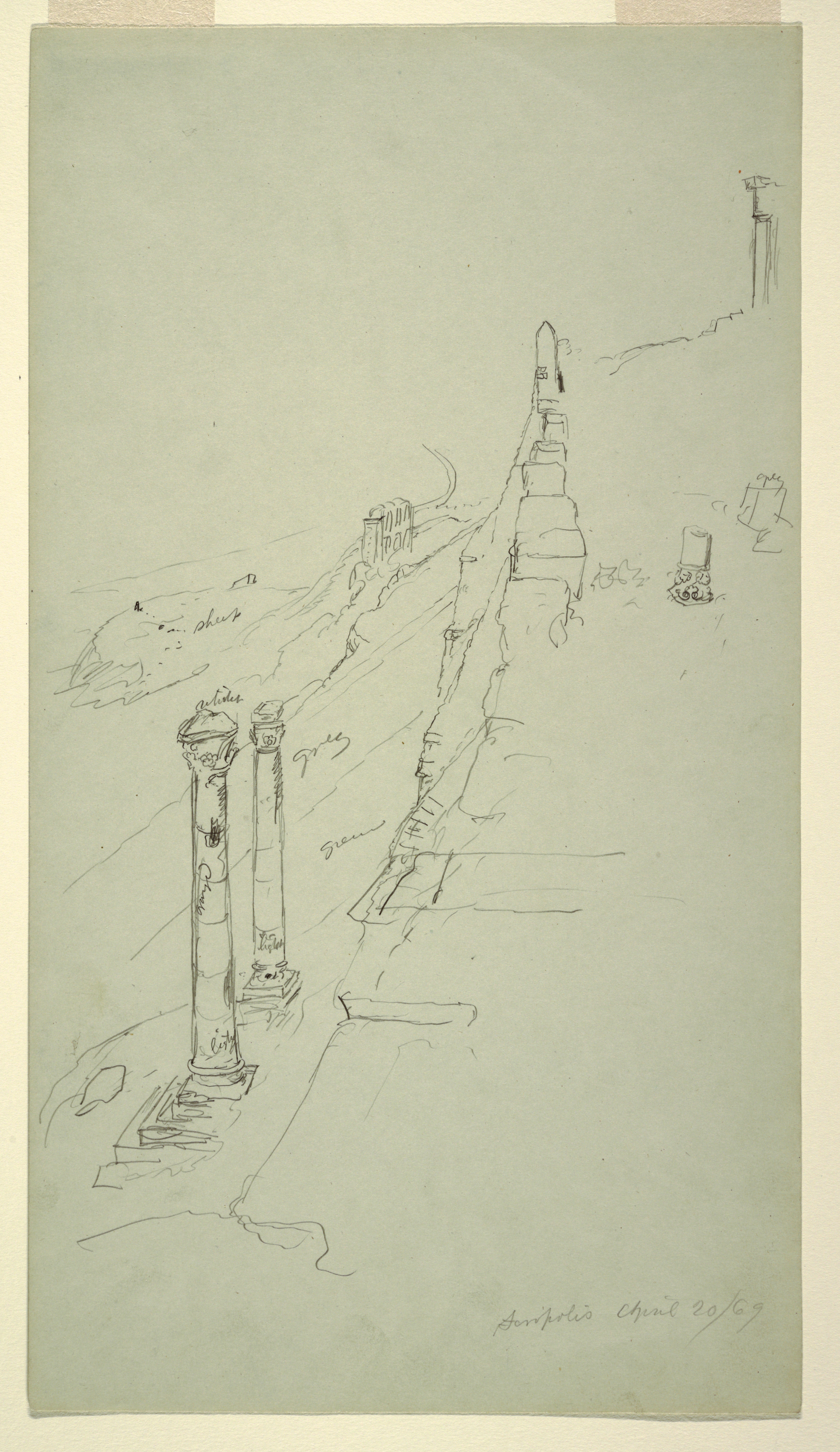 Drawing, South Side of the Acropolis, Athens, Greece; Frederic Edwin Church (American, 1826–1900); USA; graphite on light green wove paper; 44.2 × 24.6 cm (17 3/8 × 9 11/16 in.); Gift of Louis P. Church; 1917-4-596