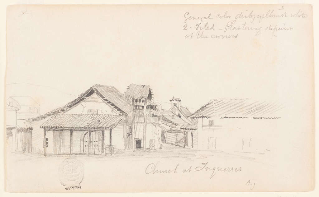 Inscribed: in graphite, upper right: General color dirty yellowish white / 2 – Tiled – Plastering deficient / at the corners; in graphite, center: 2 / 2; in graphite, lower right: Church at Tuquerres / Aug; in graphite, verso lower right: Rock / trees