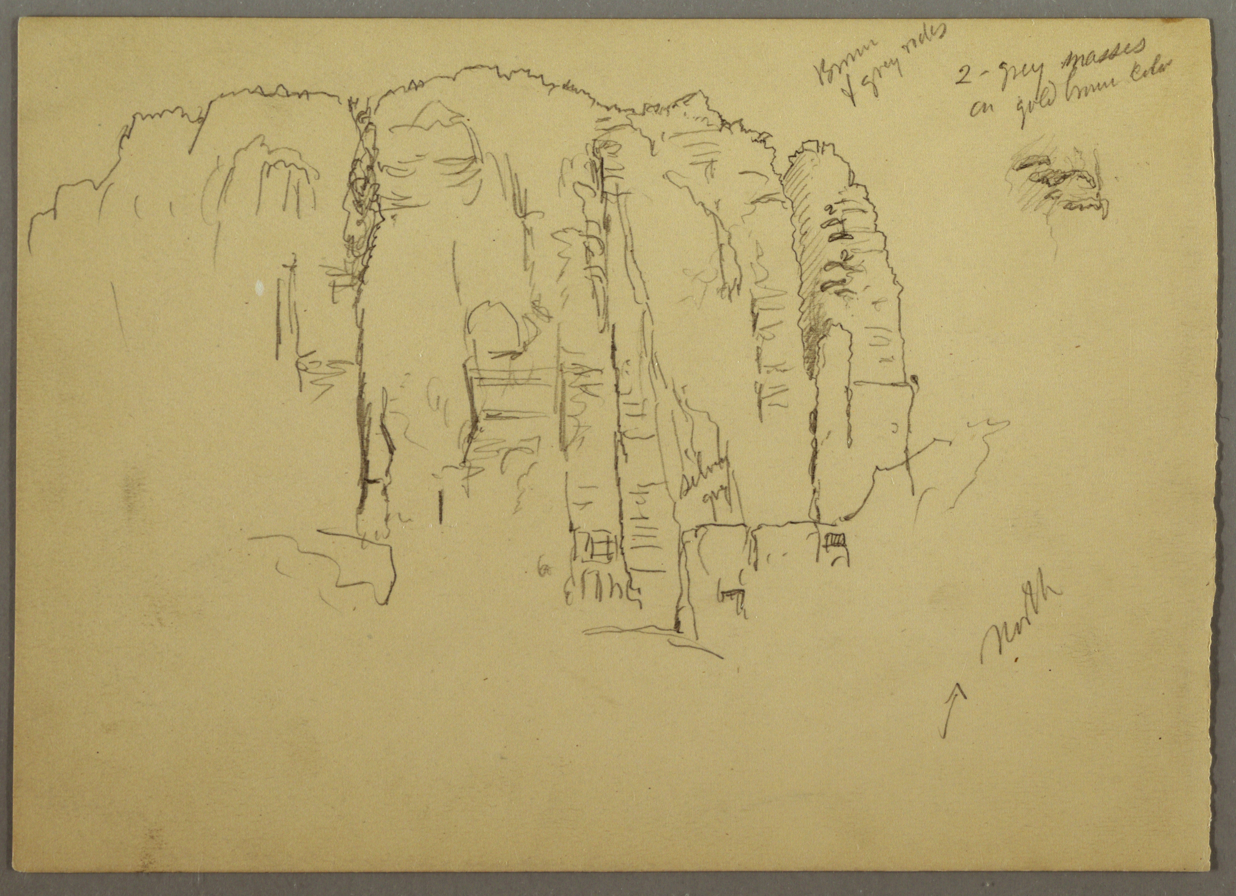 Inscribed: in graphite, upper right: Brown / & grey rocks / 2 - grey masses / on gold brown color / 2 / 2; in graphite, center: silver / grey; in graphite, lower right: North / [arrow pointing up]; in graphite, verso center left: Petra