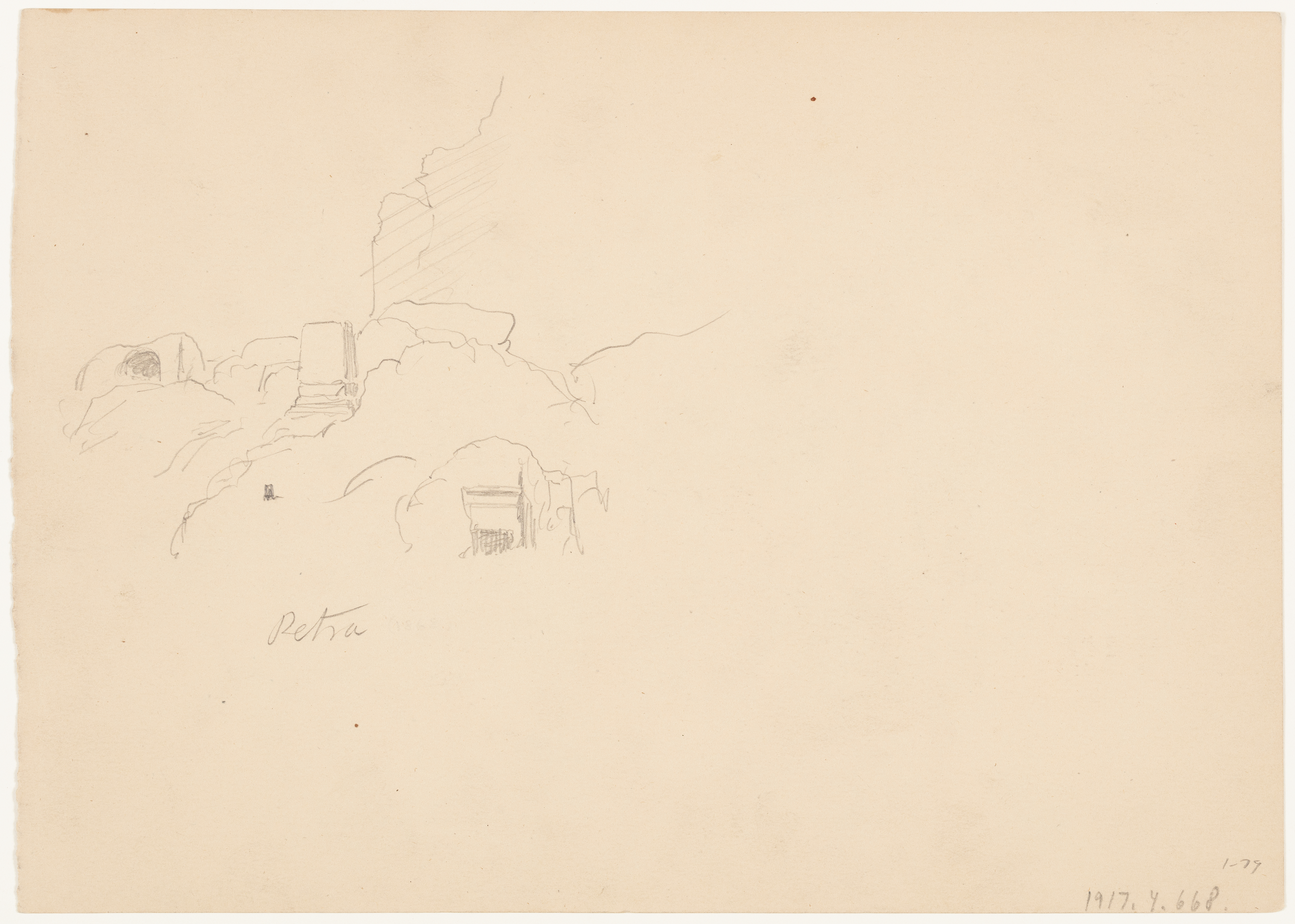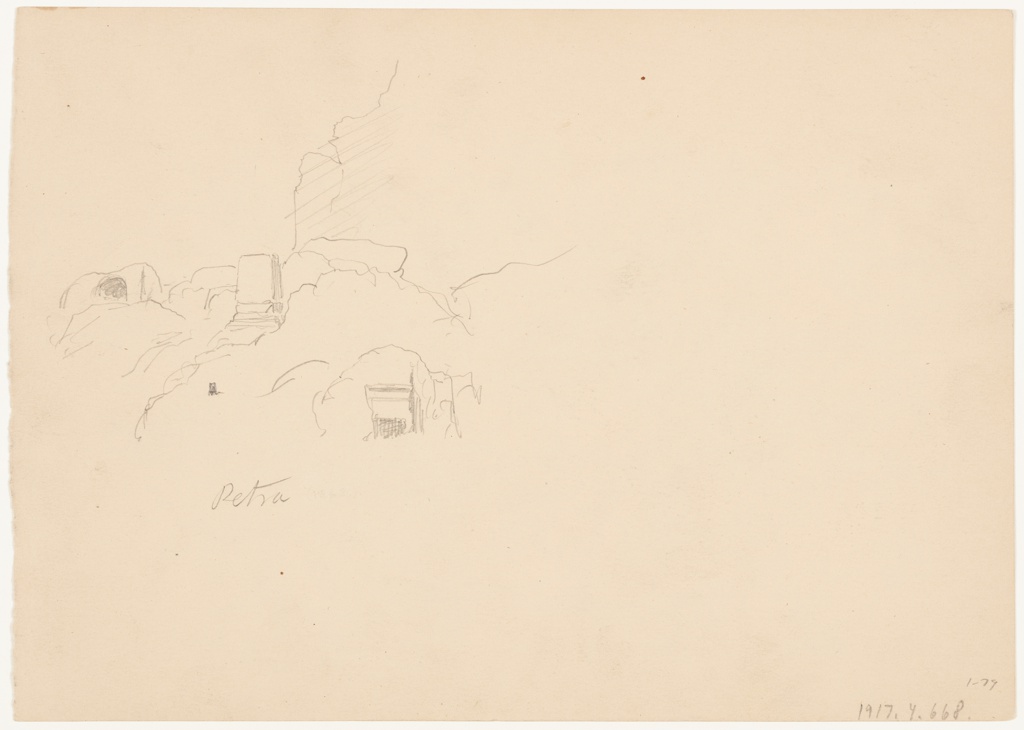 Drawing, Cliffs and Pinnacles, Petra, Jordan; Frederic Edwin Church (American, 1826–1900); USA; graphite on off-white wove paper; verso: graphite; 17.7 × 24.8 cm (6 15/16 × 9 3/4 in.); Gift of Louis P. Church; 1917-4-668