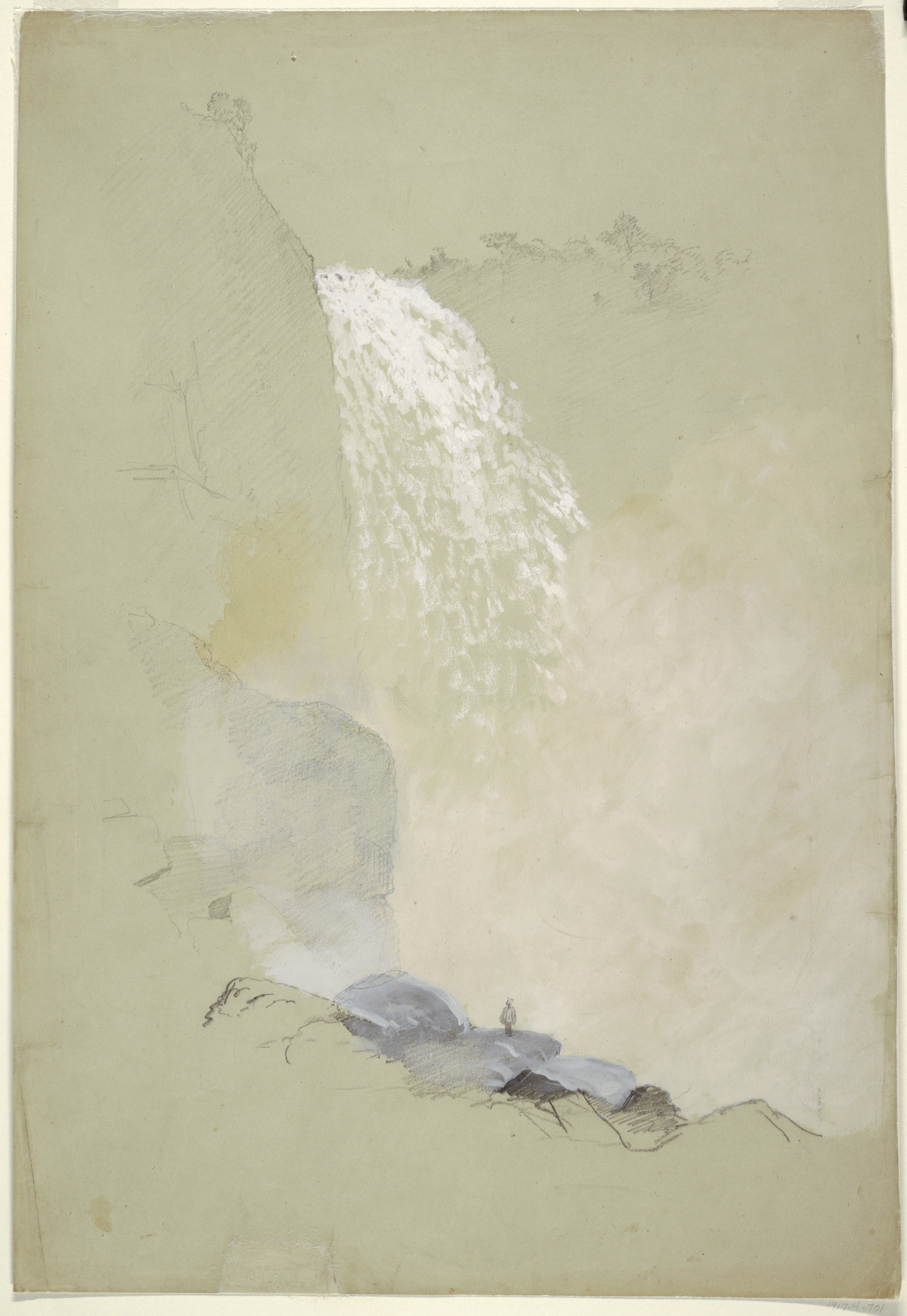 Drawing, Tequendama Falls near Bogotá, Colombia; Frederic Edwin Church (American, 1826–1900); Colombia; graphite and white gouache on gray-green paper; 46.5 × 32 cm (18 5/16 × 12 5/8 in.); Gift of Louis P. Church; 1917-4-701
