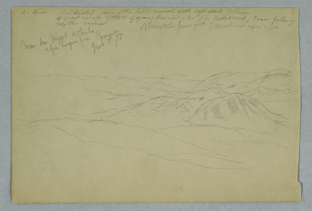 Inscribed in graphite, upper margin: 2 River Cultivated some of the hills crowned with soft dark foliage / great scarcity of tints of green (brownish also) in patchwork, trees following / up the ravines Mountains (lower part) much cut up - in peaks / Near San Miguel de Chimbo / a few Leagues from Guaranda / June 3rd , 57