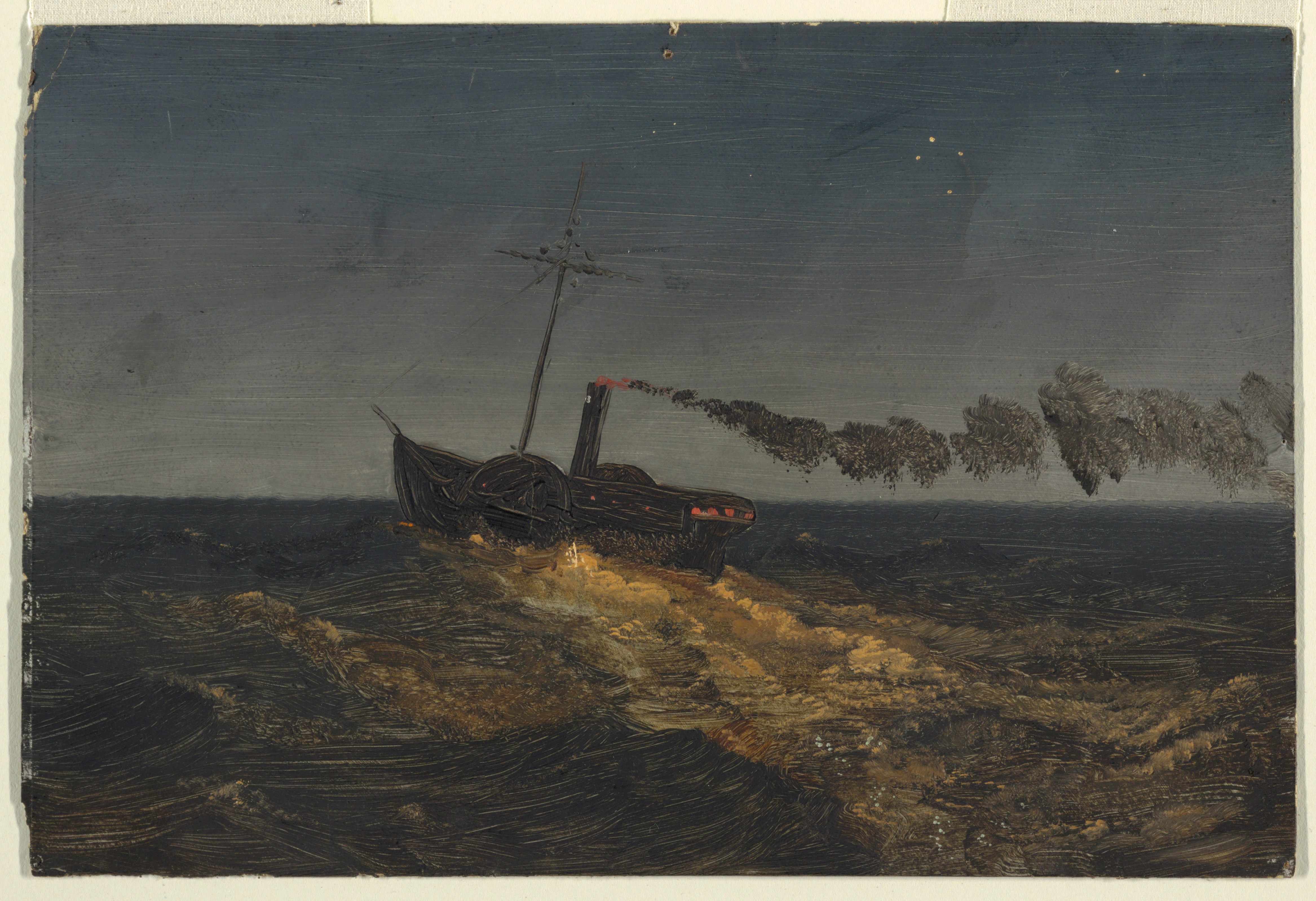 Drawing, Paddle Steamer at Dusk; Frederic Edwin Church (American, 1826–1900); USA; brush and oil on dark brown paperboard; 18.2 × 27.2 cm (7 3/16 × 10 11/16 in.); Gift of Louis P. Church; 1917-4-716