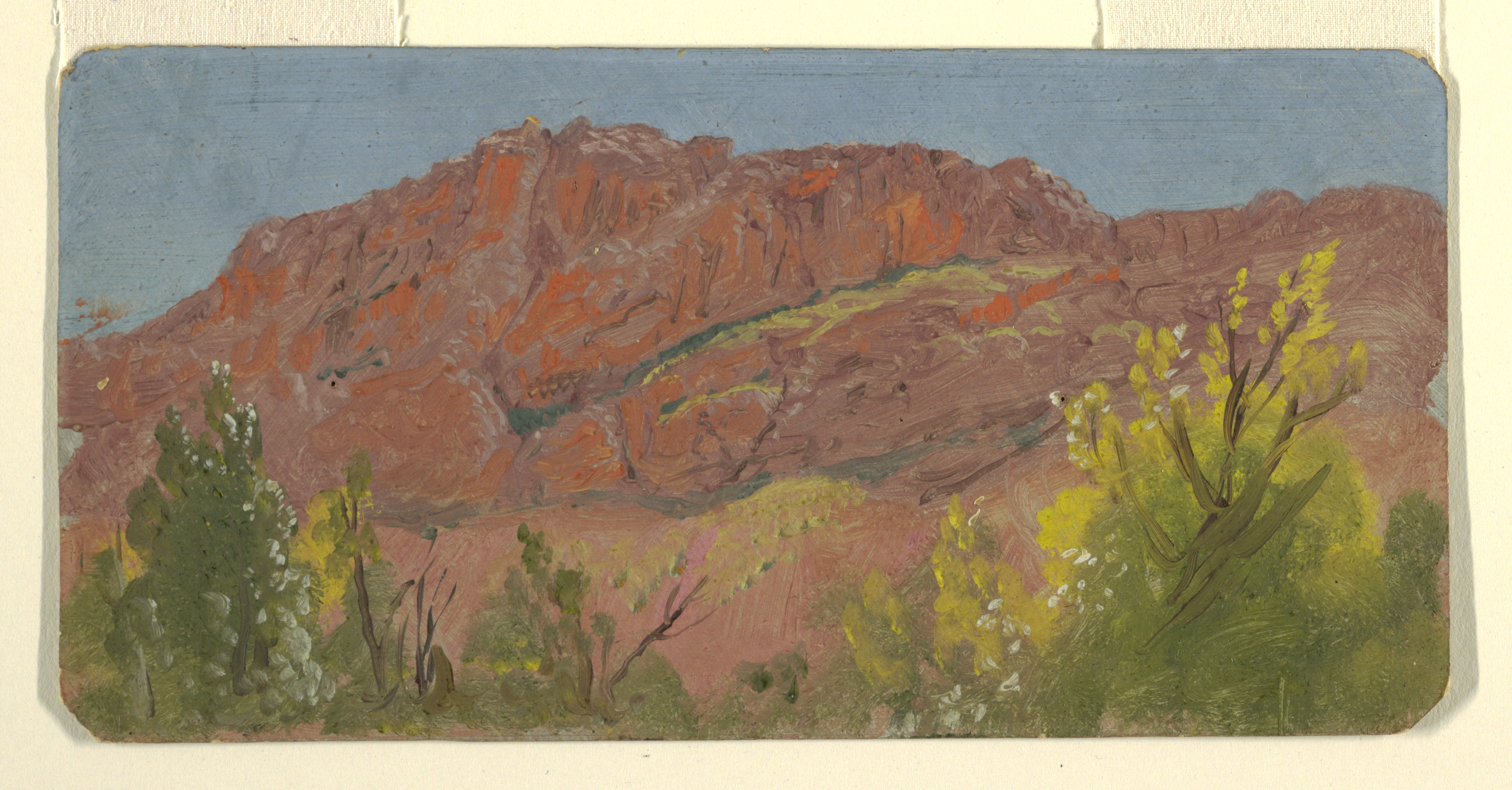 Drawing, Mountain View on the Road to Baalbek, Lebanon; Frederic Edwin Church (American, 1826–1900); USA; brush and oil on brown paperboard; 11.4 × 22.9 cm (4 1/2 × 9 in.); Gift of Louis P. Church; 1917-4-728