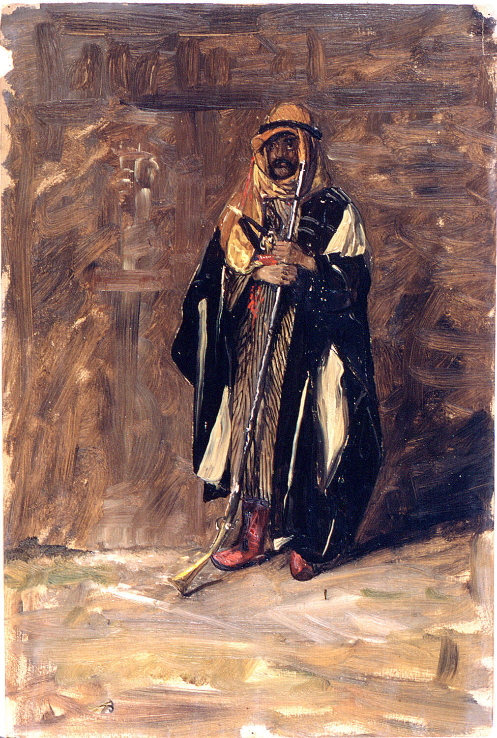 Drawing, Standing Bedouin Figure; Frederic Edwin Church (American, 1826–1900); USA; oil and graphite on paperboard; 35.6 × 23.6 cm (14 in. × 9 5/16 in.); Gift of Louis P. Church; 1917-4-751-b