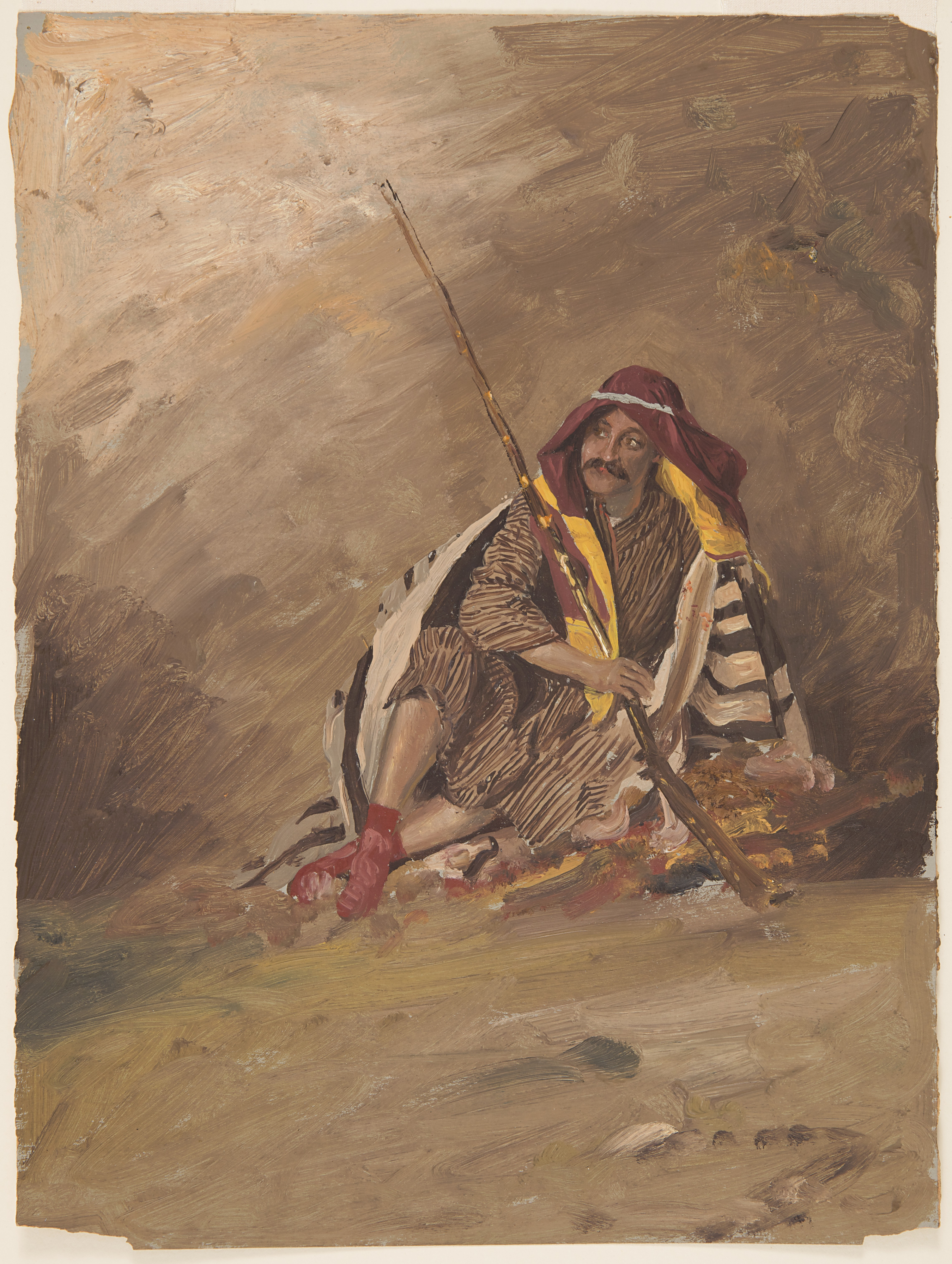 Drawing, Seated Bedouin Figure; Frederic Edwin Church (American, 1826–1900); USA; oil paint on brown paper; 35.1 × 26.6 cm (13 13/16 × 10 1/2 in.); Gift of Louis P. Church; 1917-4-752-b