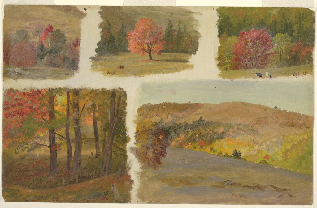 Drawing, Autumn Vignettes, Vermont; Frederic Edwin Church (American, 1826–1900); USA; oil and graphite on tan paperboard; 30 × 46.9 cm (11 13/16 × 18 7/16 in.); Gift of Louis P. Church; 1917-4-764