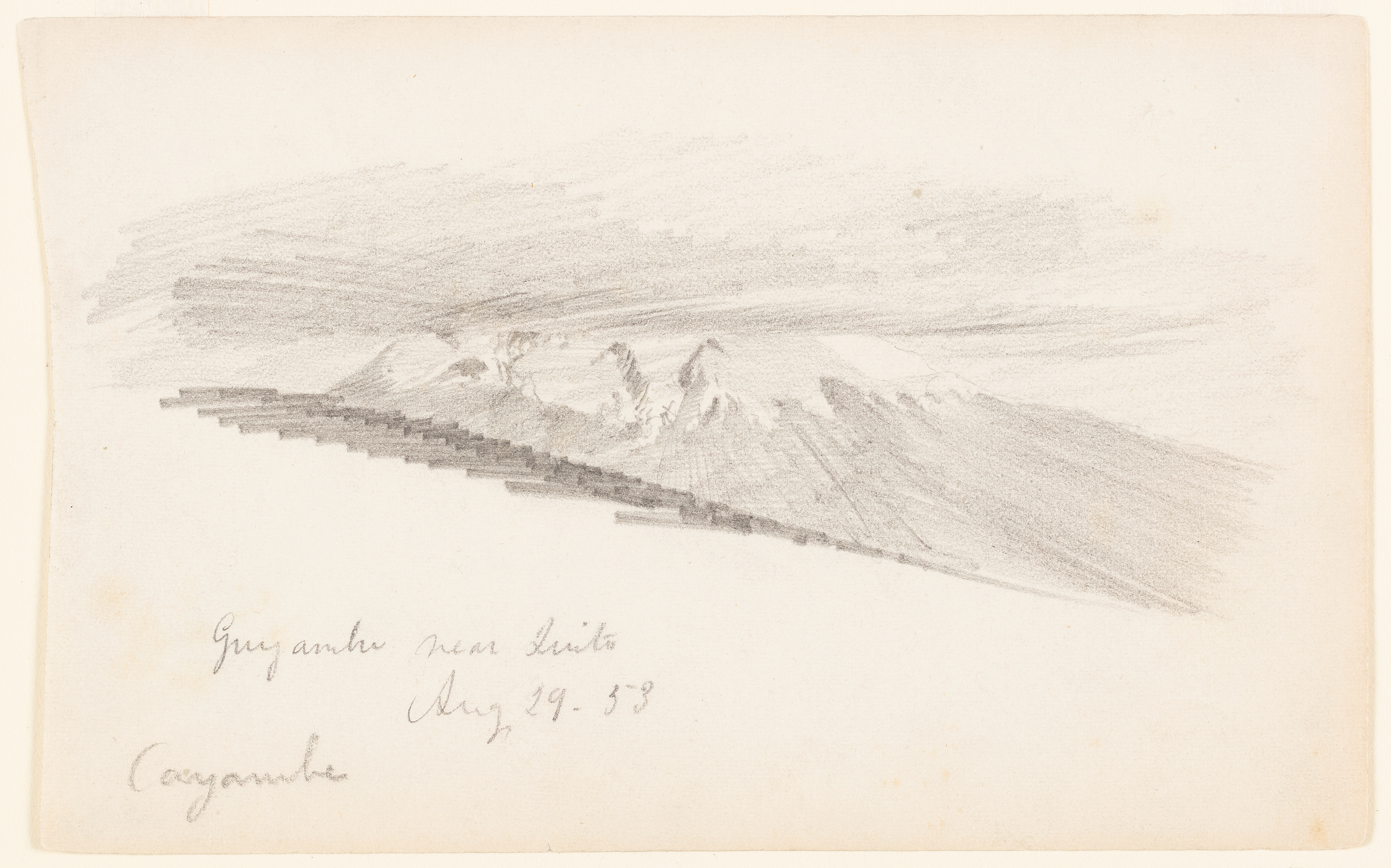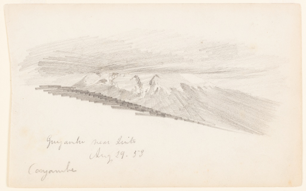 Inscribed: in graphite, lower left: Guyamba near Quito / Aug 29- 53 / Cayambe; in graphite, verso center [not in Church's hand]: Templo de Guapulo / Js [or Jo] modesto Larrea; in graphite, verso lower center: From his hacienda / Sep 1- /53