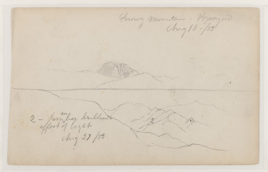 Inscribed: in graphite, upper right: Snowy Mountain - Popoyan / August 10 - /53; in graphite, lower left: 2 - Remember brilliant / effect of light / Aug 27 /53; in graphite, lower right: 2 / 2