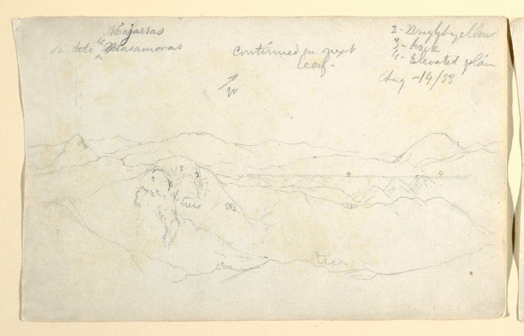 Inscribed: in graphite, upper left: Mojarras / La tete de Masamoras; in graphite, upper center: continued on next / leaf - / [arrow point up and to the right] W; in graphite, upper right: 2 – Bright yellow / 3 – Rock / 4 – Elevated plain / Aug -14 /53; in graphite, center: 4 4 / 3 3 2 / 2 / trees / trees