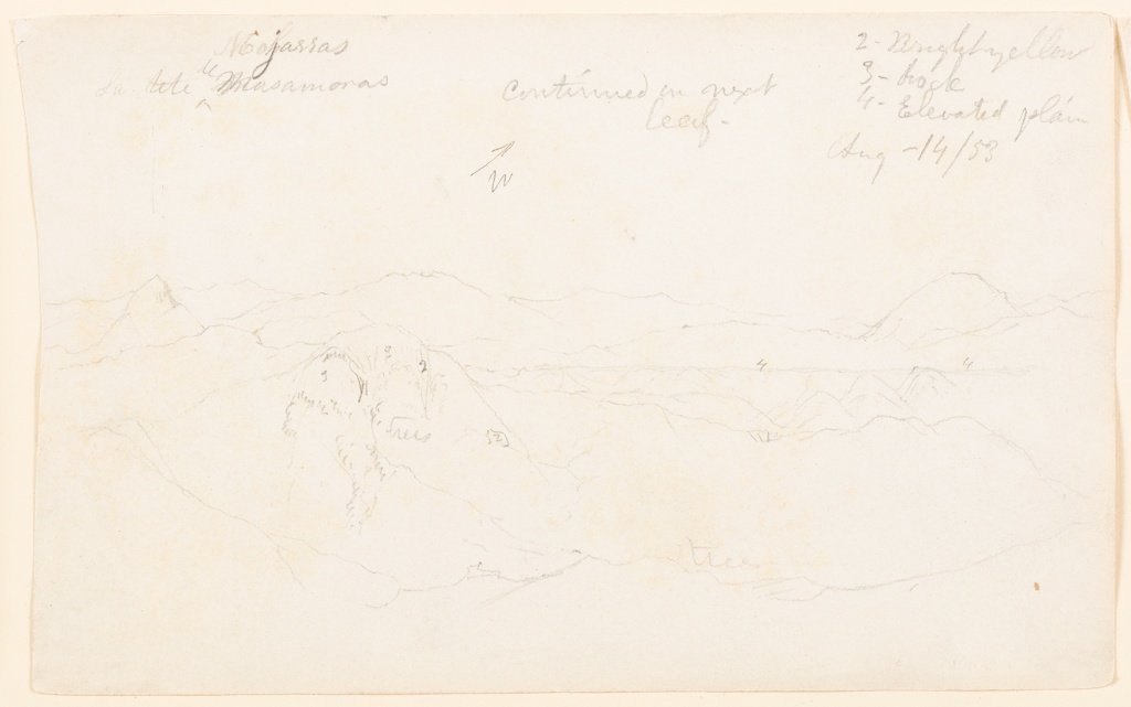 Inscribed: in graphite, upper left: Mojarras / La tete de Masamoras; in graphite, upper center: continued on next / leaf - / [arrow point up and to the right] W; in graphite, upper right: 2 – Bright yellow / 3 – Rock / 4 – Elevated plain / Aug -14 /53; in graphite, center: 4 4 / 3 3 2 / 2 / trees / trees