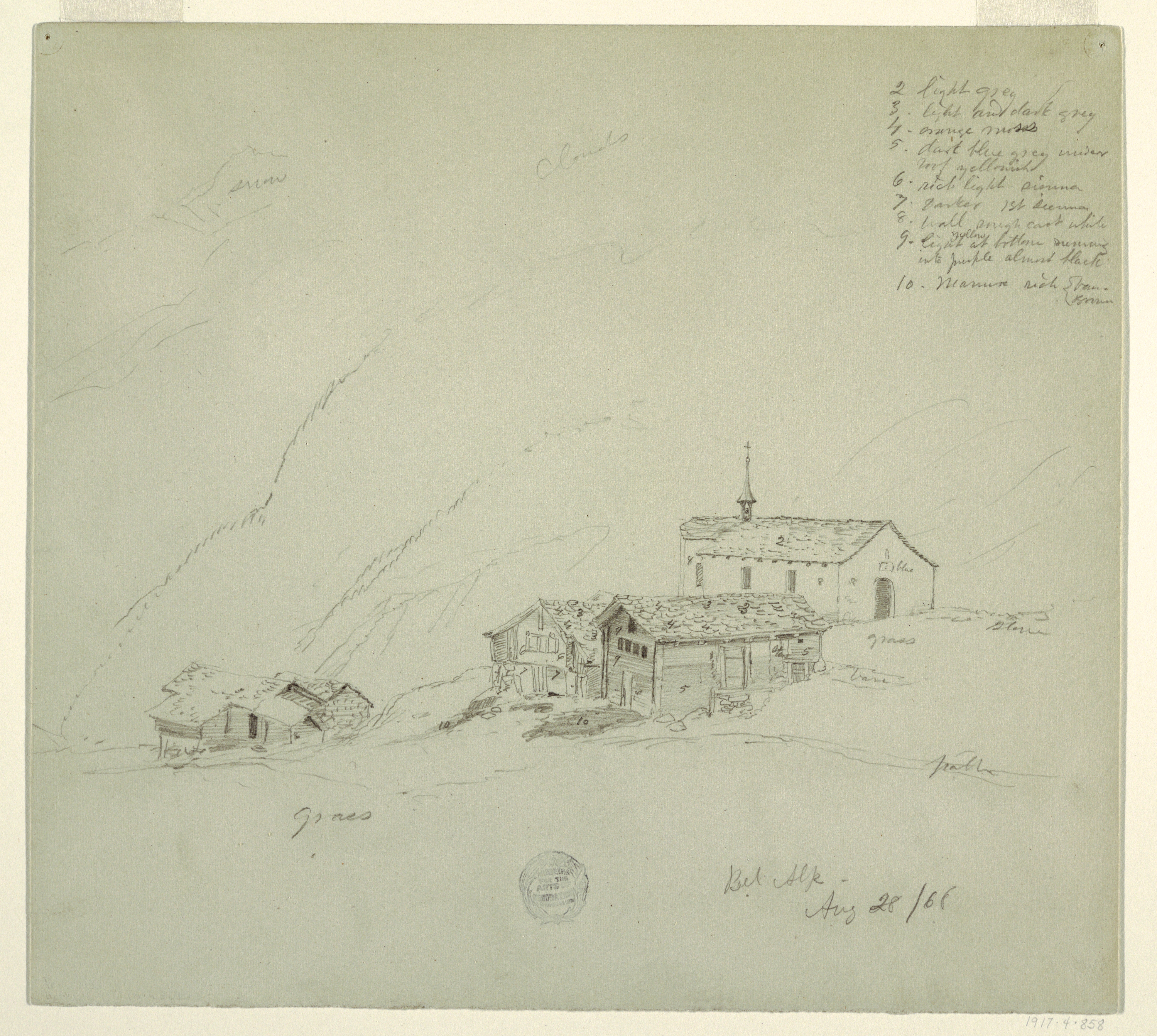 Inscribed: in graphite, upper left: Snow; in graphite, upper center: Clouds; in graphite, upper right: 2 light grey / 3 - light and dark grey / 4 - orange moss / 5 - dark blue grey wider / roof yellowish / 6 - rich light sienna / 7 - Darker Bt sienna / 8 - wall rough cast white / 9 - light / yellow / at bottom running / into purple almost black / 10 - Manure rich {van / {brown; in graphite, center: 2 / 8 / 8 8 / 3 3 3 / 4 3 4 4 / 4 3 9 / 6 6 9 stone 5 / 7 7 5 / 10 10; center right: blue / stone / grass / bare / path; in graphite, lower left: grass; in graphite, lower right: Bel Alp - / Aug 28 /68
