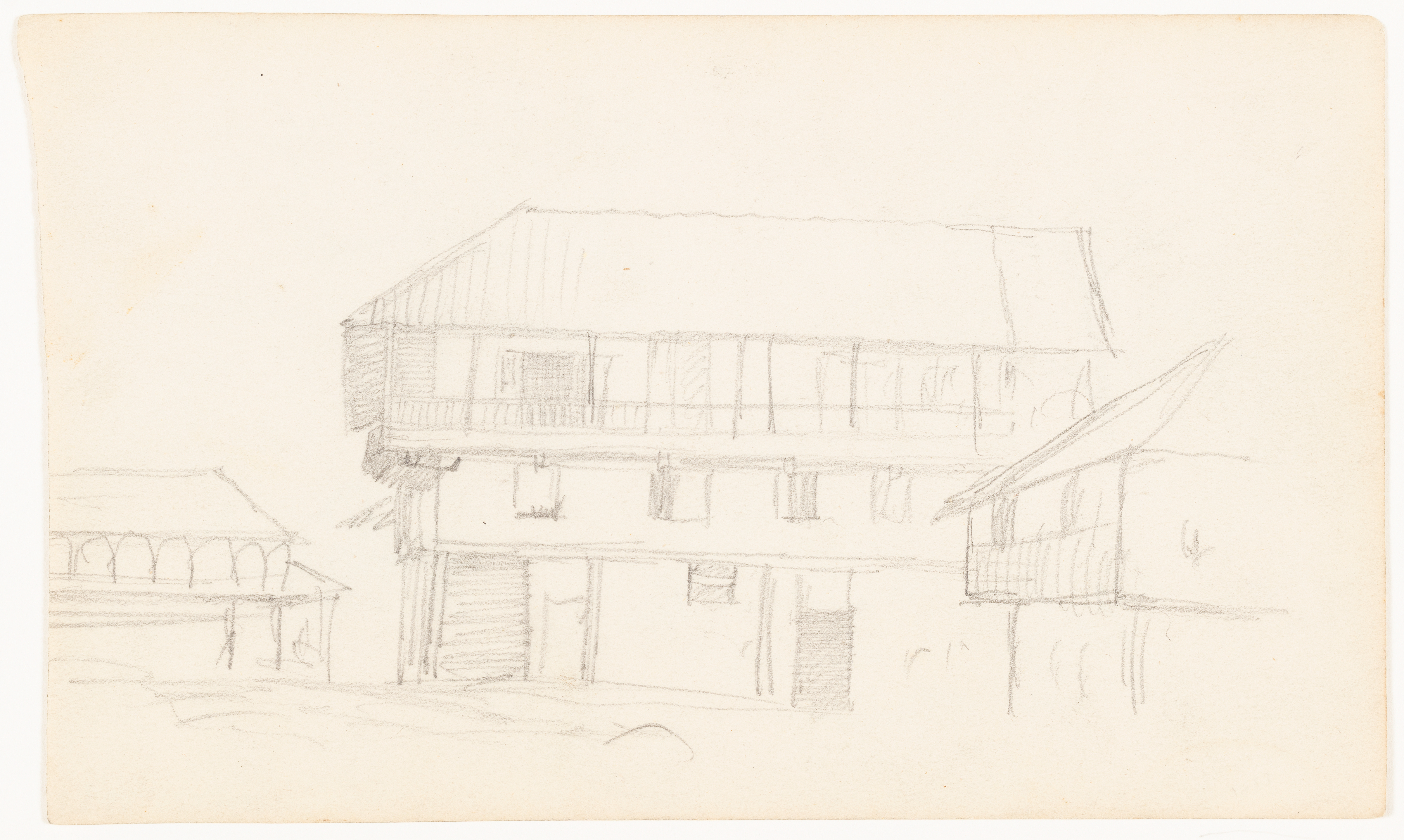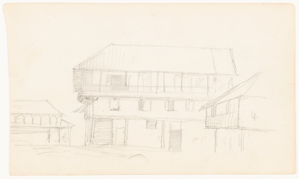 Drawing, A Street Corner in Guayaquil, Ecuador; Frederic Edwin Church (American, 1826–1900); USA; graphite on white wove paper; verso: graphite; 10.9 × 19 cm (4 5/16 × 7 1/2 in.); Gift of Louis P. Church; 1917-4-884
