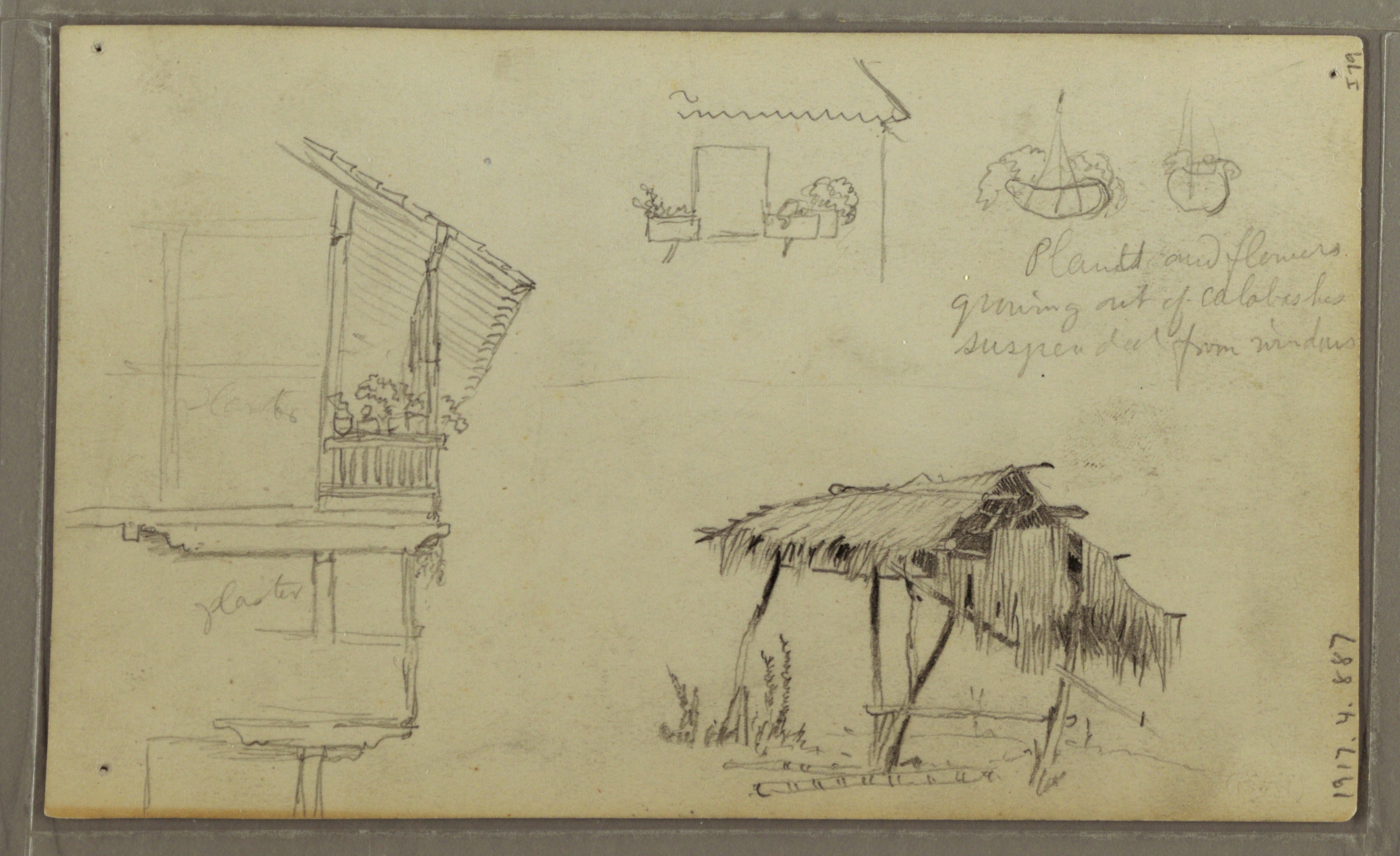 Inscribed in graphite, upper right: Thick grove of cocos / Stems and centre of leaf strongly / marked; upper left: Delicate yellow green light foliage / very regularly formed; lower right: sugar mill; verso upper right: Plants and flowers / growing out of calabashes / suspended from windows; center left: plaster; lower left: plaster