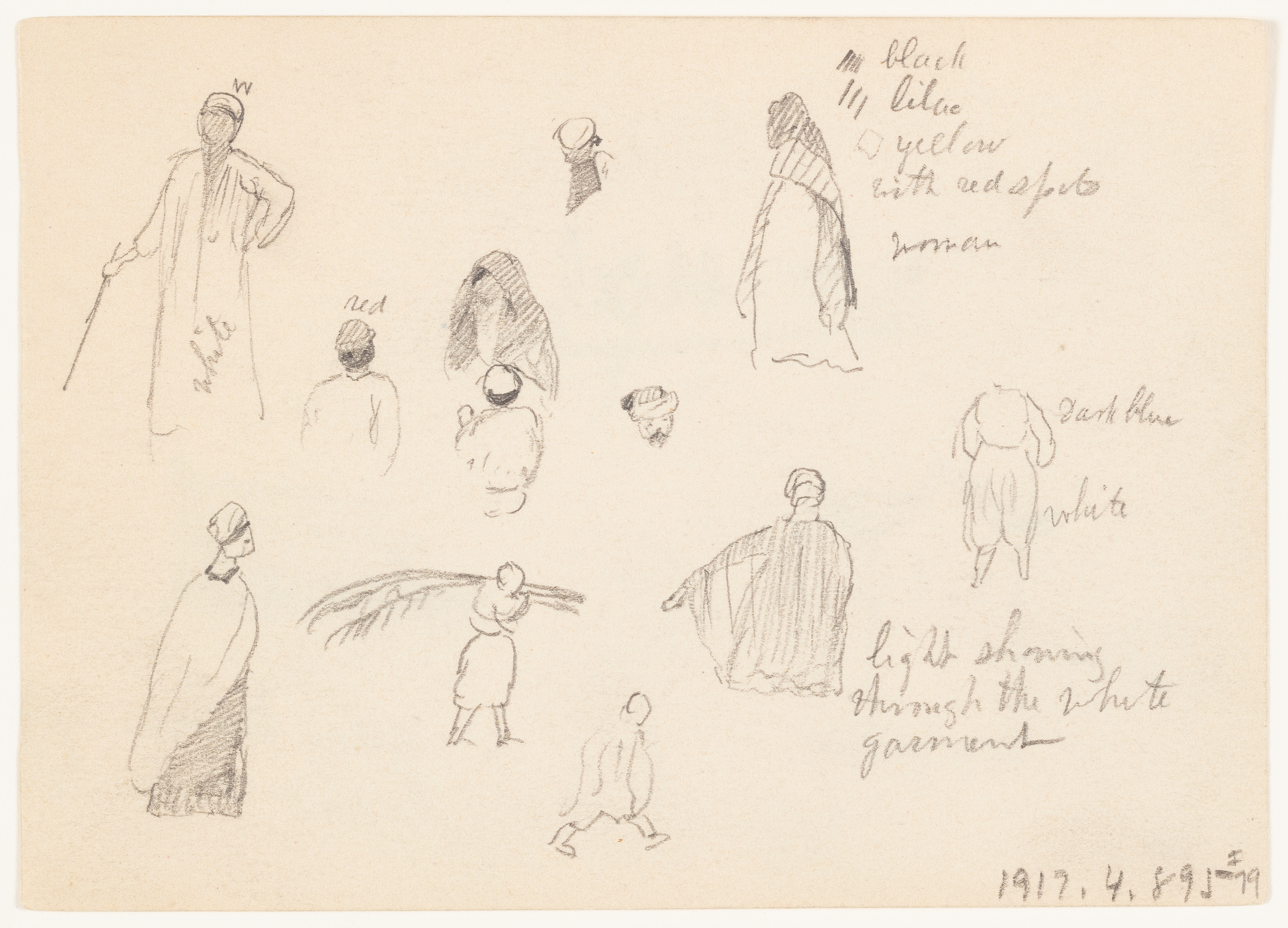 Inscribed: in graphite, upper center: Jaffa; in graphite, lower left: bay / window / Jaffa; in graphite, lower right: green transparent / water under boat; in graphite, verso upper left: w / white / red; in graphite, upper right: black / lilac / yellow / with red spots / woman; in graphite, center right: Dark blue / white; in graphite, lower right: Light shining / through the white / garment