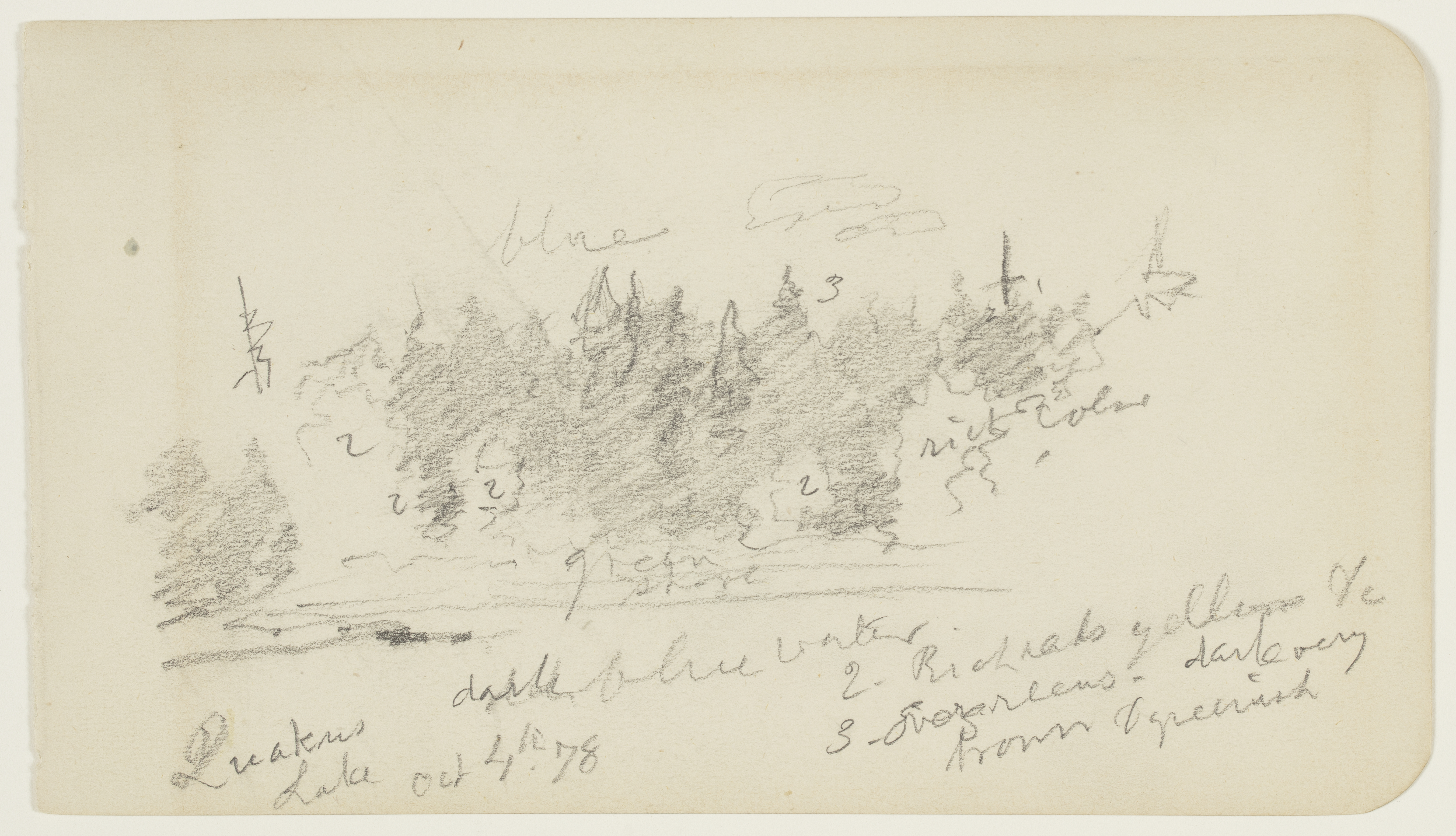 Inscribed: in graphite, center: blue / 3 / 2 / rich color / 2 2 2 / green shore; in graphite, lower left: Quakus / Lake / Oct 4th - 78; in graphite, lower center: dark blue water; in graphite, lower right: 2 - Rich reds yellows & c / 3 - Evergreens - dark very / brown & greenish