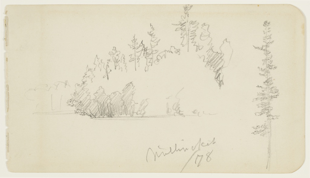 Drawing, Wooded Shoreline, Lake Millinocket, Maine; Frederic Edwin Church (American, 1826–1900); USA; graphite on white wove paper; 10.1 × 17.9 cm (4 in. × 7 1/16 in.); Gift of Louis P. Church; 1917-4-984-c