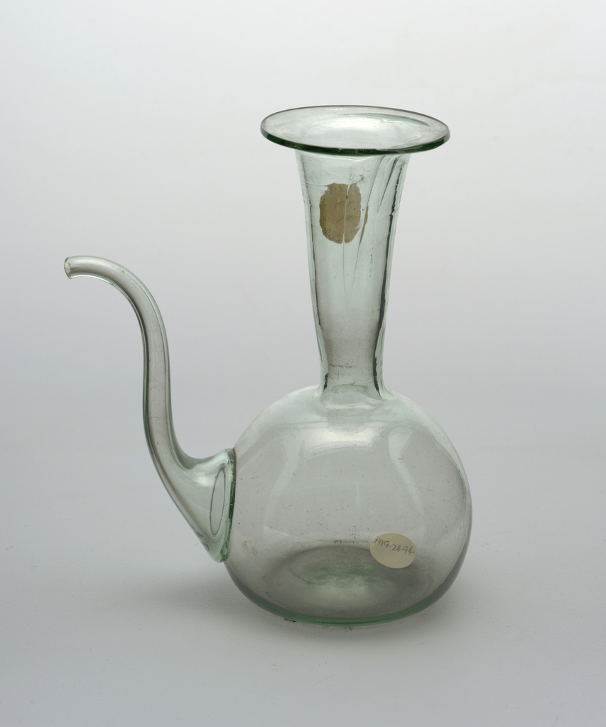 This is a Pitcher. It is dated 17th–18th century and we acquired it in 1919. Its medium is clear and greensih glass. It is a part of the Product Design and Decorative Arts department.