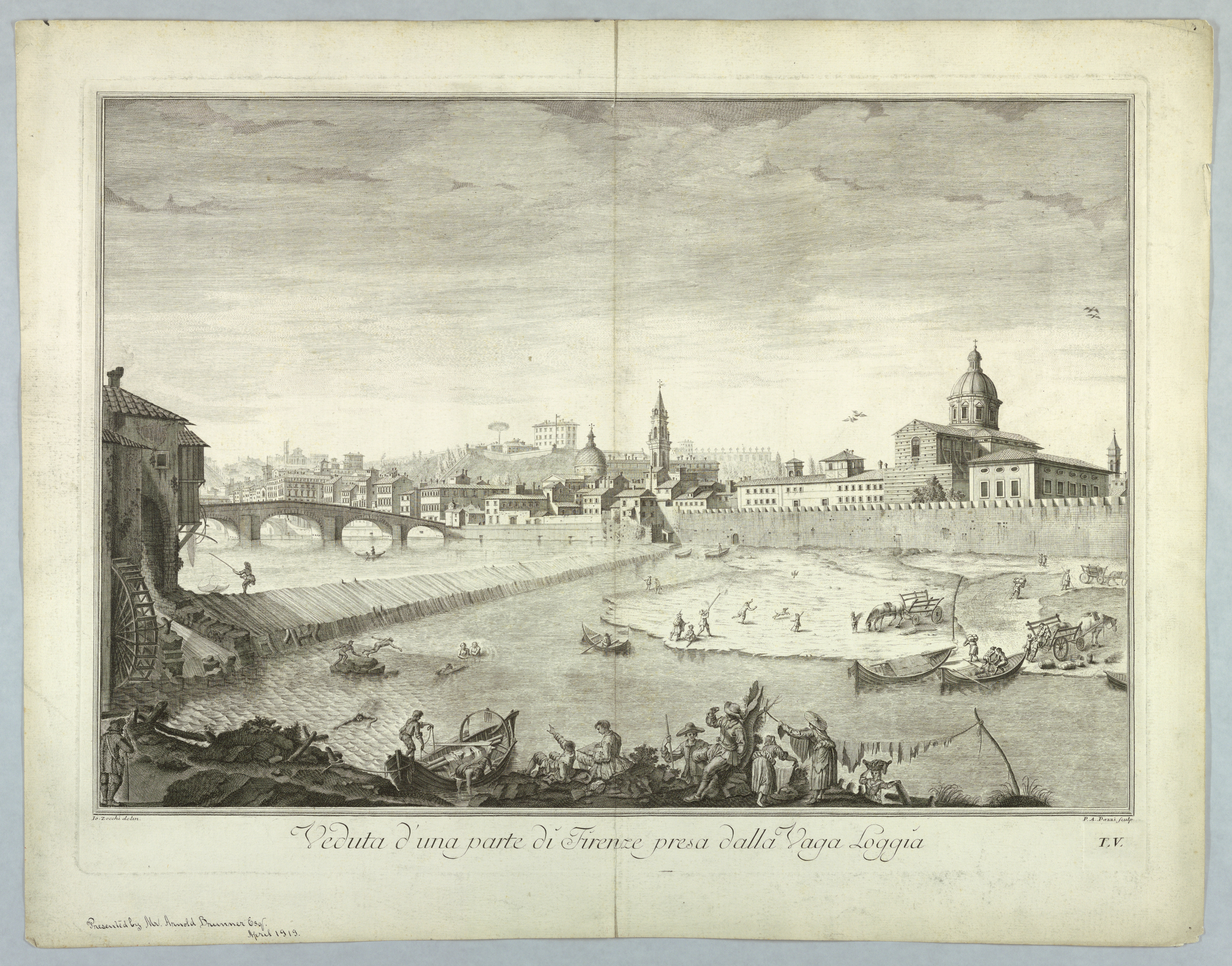 Bottom margin: "Io. Zocchi delin." "Veduta d'una parte di Firenze presa dalla Vaga Loggia." "P. A. Pazzi sculp."; "printed with a separate plate: "T.V."; Bottom left: presentation note