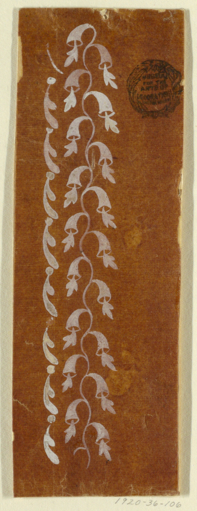 Drawing, Design for a Woven or Embroidered Vertical Border of the "Fabrique de St. Ruf"; Designed by Fabrique de Saint Ruf; France; brush and gouache on glazed tracing paper; 16.4 × 5.6 cm (6 7/16 × 2 3/16 in.); Gift of Eleanor and Sarah Hewitt; 1920-36-106