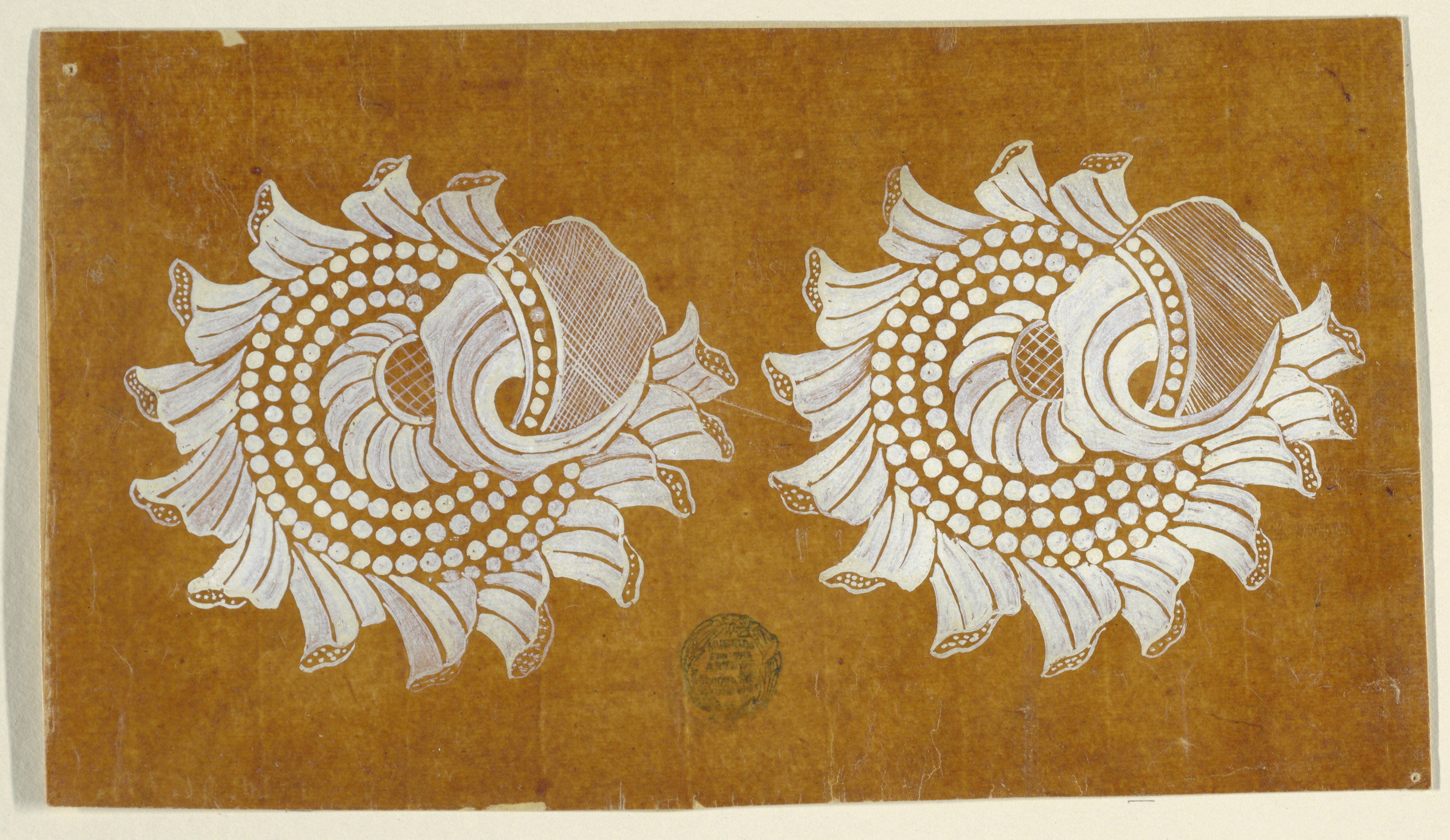 Drawing, Design for an Embroidered or Woven Fabric of the "Fabrique de St. Ruf"; Designed by Fabrique de Saint Ruf; France; brush and white gouache on glazed tracing paper; 14.4 × 25.6 cm (5 11/16 × 10 1/16 in.); Gift of Eleanor and Sarah Hewitt; 1920-36-149