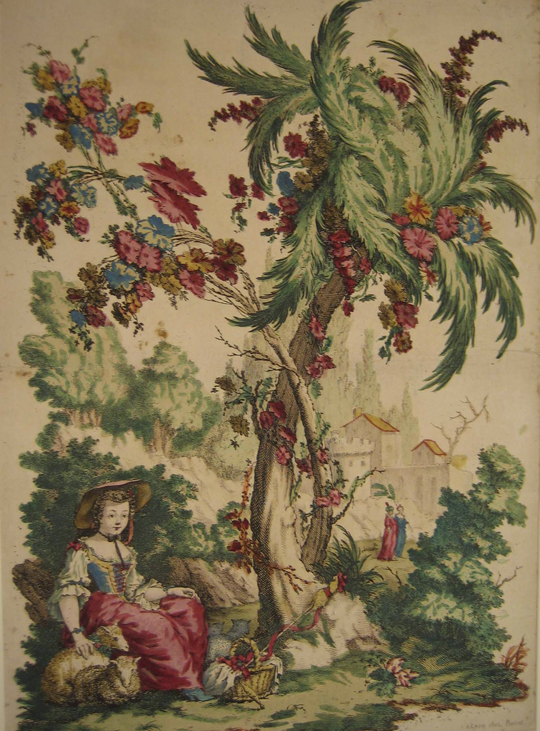 Print, A Little Shepherdess; Designed by Alexis Peyrotte (French, 1699–1769); Engraved by Jean Charles Francois (1717–1769); Published by Jean-Charles François (1717 - 1769); France; hand-colored etching with watercolors on paper; 79.5 x 56.5 cm (31 5/16 x 22 1/4 in. ); Gift of Eleanor and Sarah Hewitt; 1921-22-261