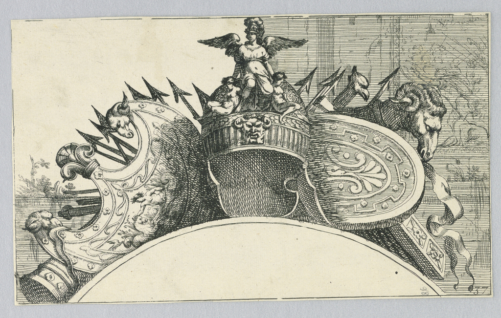 Print, Trophy of Arms (Un trophée d'armes au-dessus d'un cintre); Engraved by Jean Le Pautre (French, 1618–1682); engrapving on off-white laid paper; Overall: 12.6 x 21 cm (4 15/16 x 8 1/4 in.); Purchased for the Museum by the Advisory Council; 1921-6-128