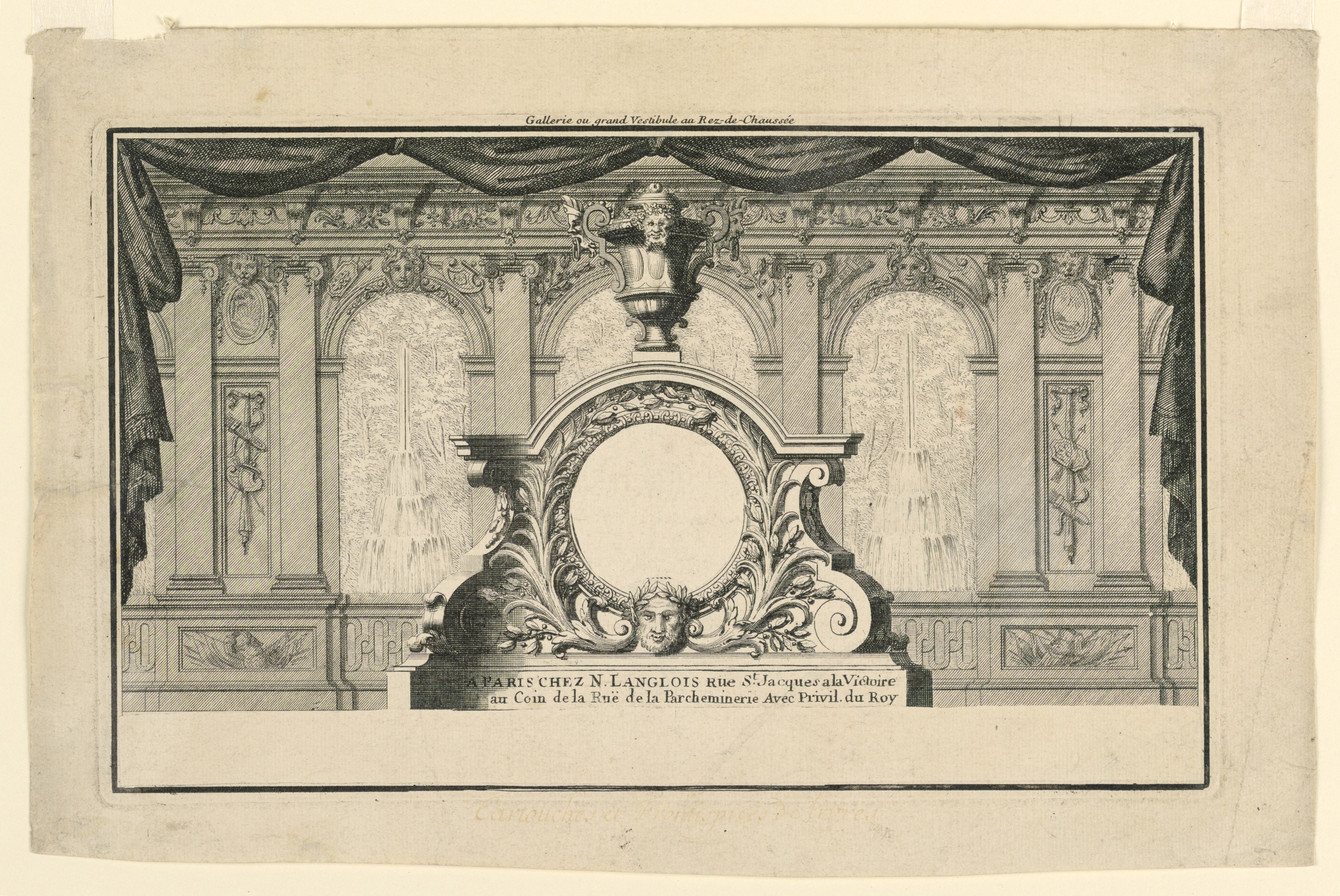 Lettered in plate, upper center: Gallerie ou grand Vestibule au Rez-de-Chaussée; inscribed in ink, below plate, lower center: Cartouches et Frontispieces de Livres