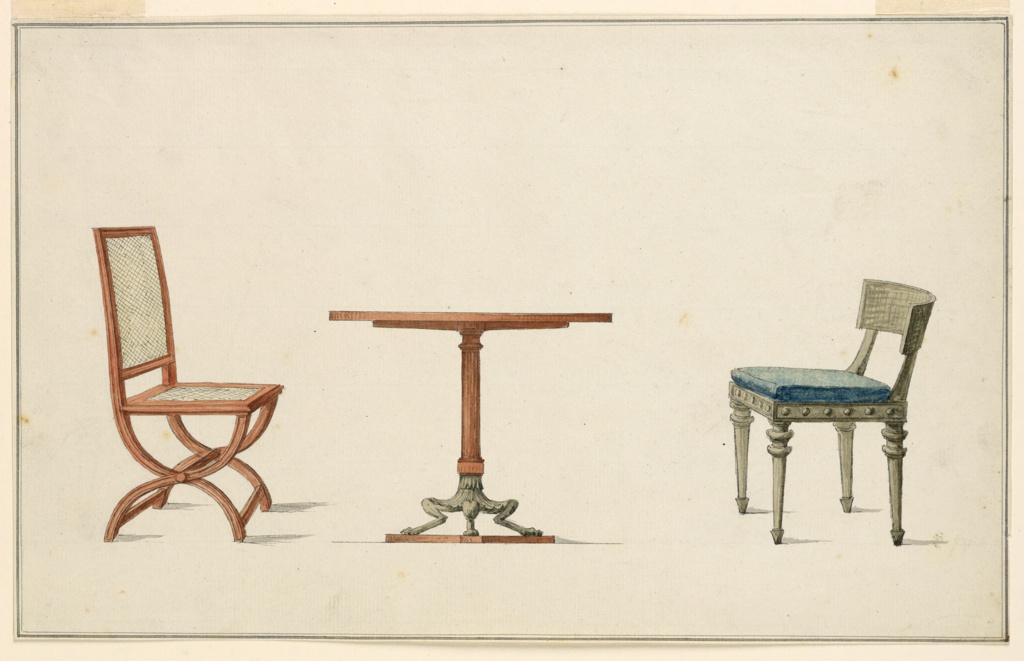 Drawing, Two Chairs and a Table; Designed by Jean Démosthène Dugourc (French, 1749–1825); Attributed to Georges Jacob (French, 1739–1814), Henri Jacob (1753–1824); Attributions: Richard de Lalonde (French, active 1780–96); France; brush and watercolor, pen and black ink, graphite on white laid paper; 21.4 x 34 cm (8 7/16 x 13 3/8 in.); Purchased for the Museum by the Advisory Council; 1921-6-137-2