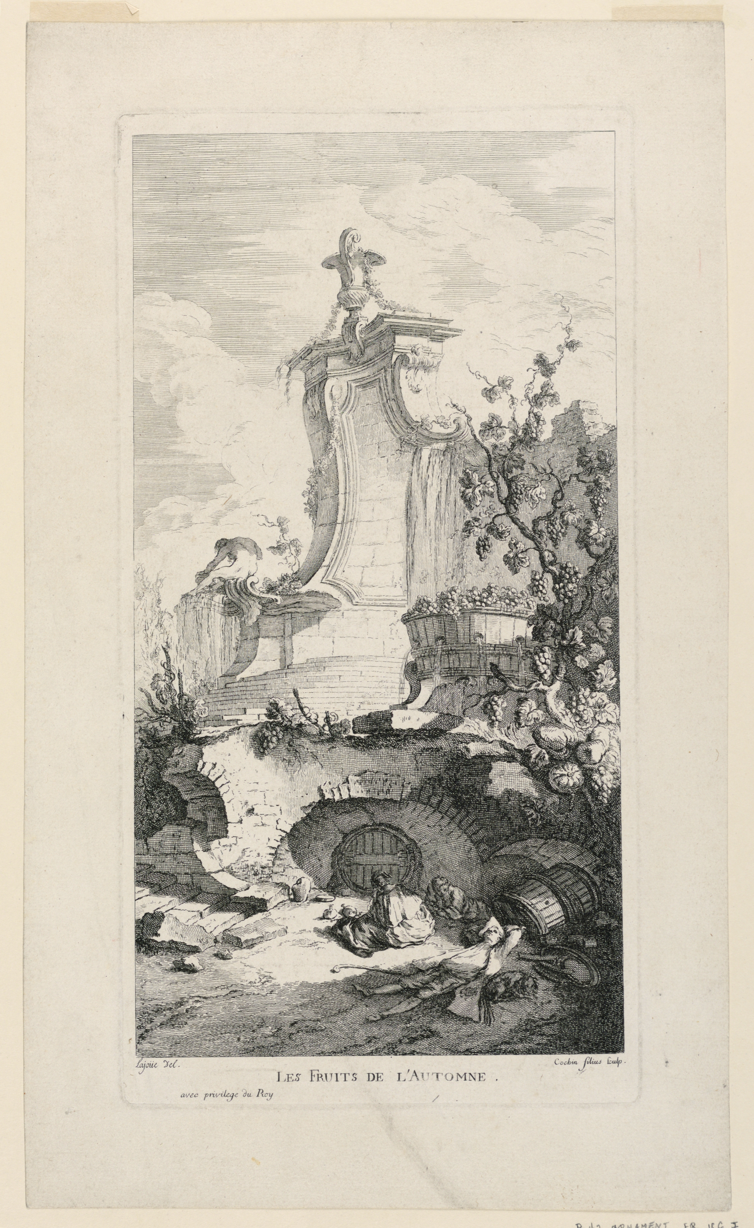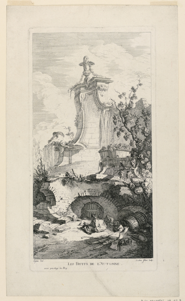Print, Les Fruits de L'Automne; Print Maker: Charles-Nicolas Cochin the elder (French, 1688 - 1754); After Jacques de Lajoüe (French, 1687–1761); France; Purchased for the Museum by the Advisory Council; 1921-6-192