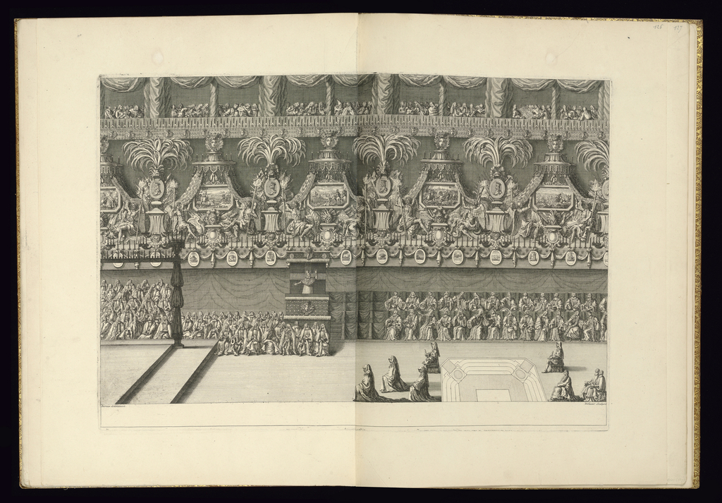This is a Bound print. It was designed by Jean Bérain the Elder and print maker: Juan Dolívar and published by Jacques Thuret. It is dated 1711 and we acquired it in 1920. Its medium is engraving on laid paper. It is a part of the Drawings, Prints, and Graphic Design department.