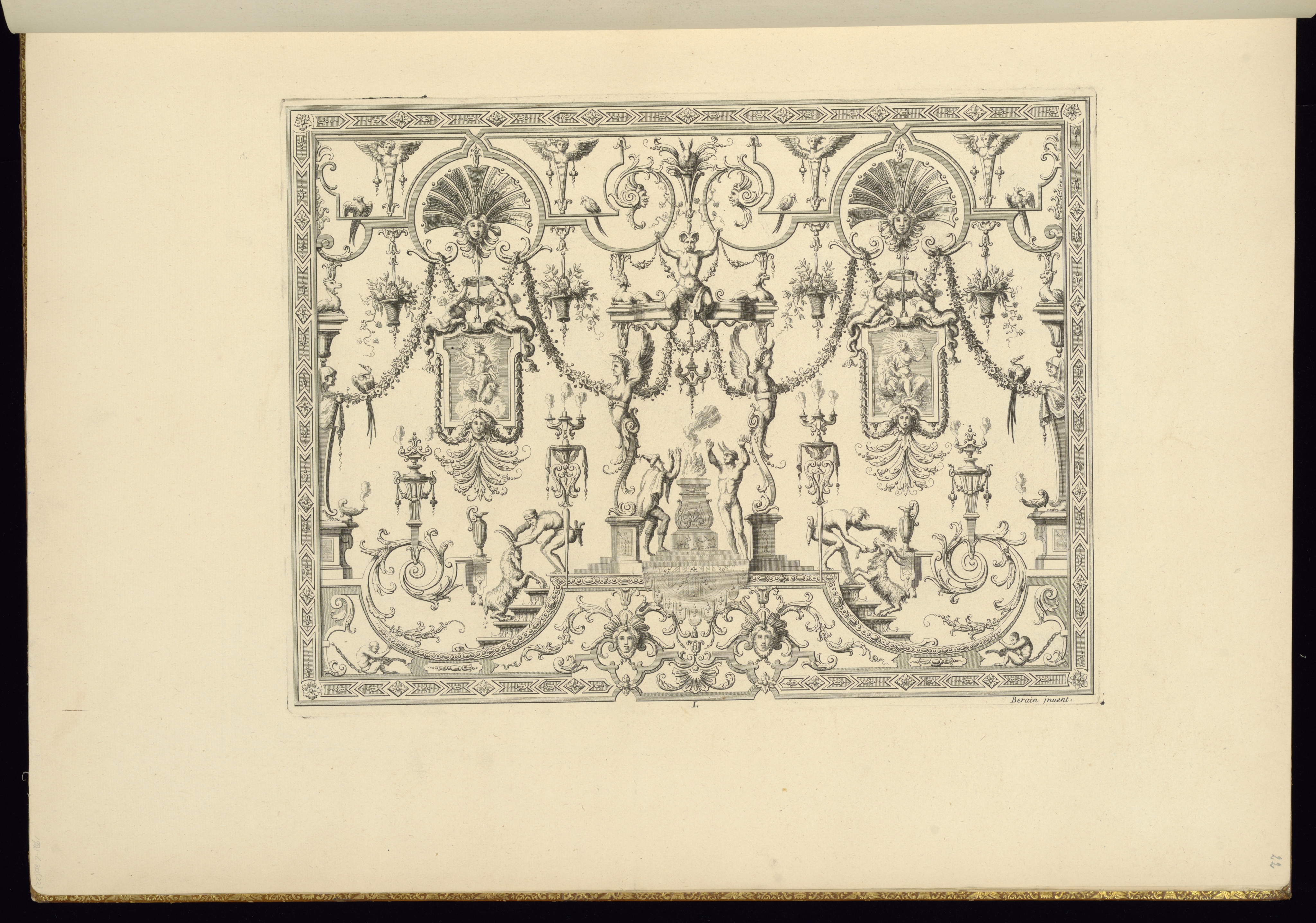 Bound Print, Panel Design of Grotesque Ornaments; Designed by Jean Bérain the Elder (French, 1640–1711); Published by Jacques Thuret (French, 1669–1738); France; engraving on laid paper; Purchased for the Museum by the Advisory Council; 1921-6-201-22