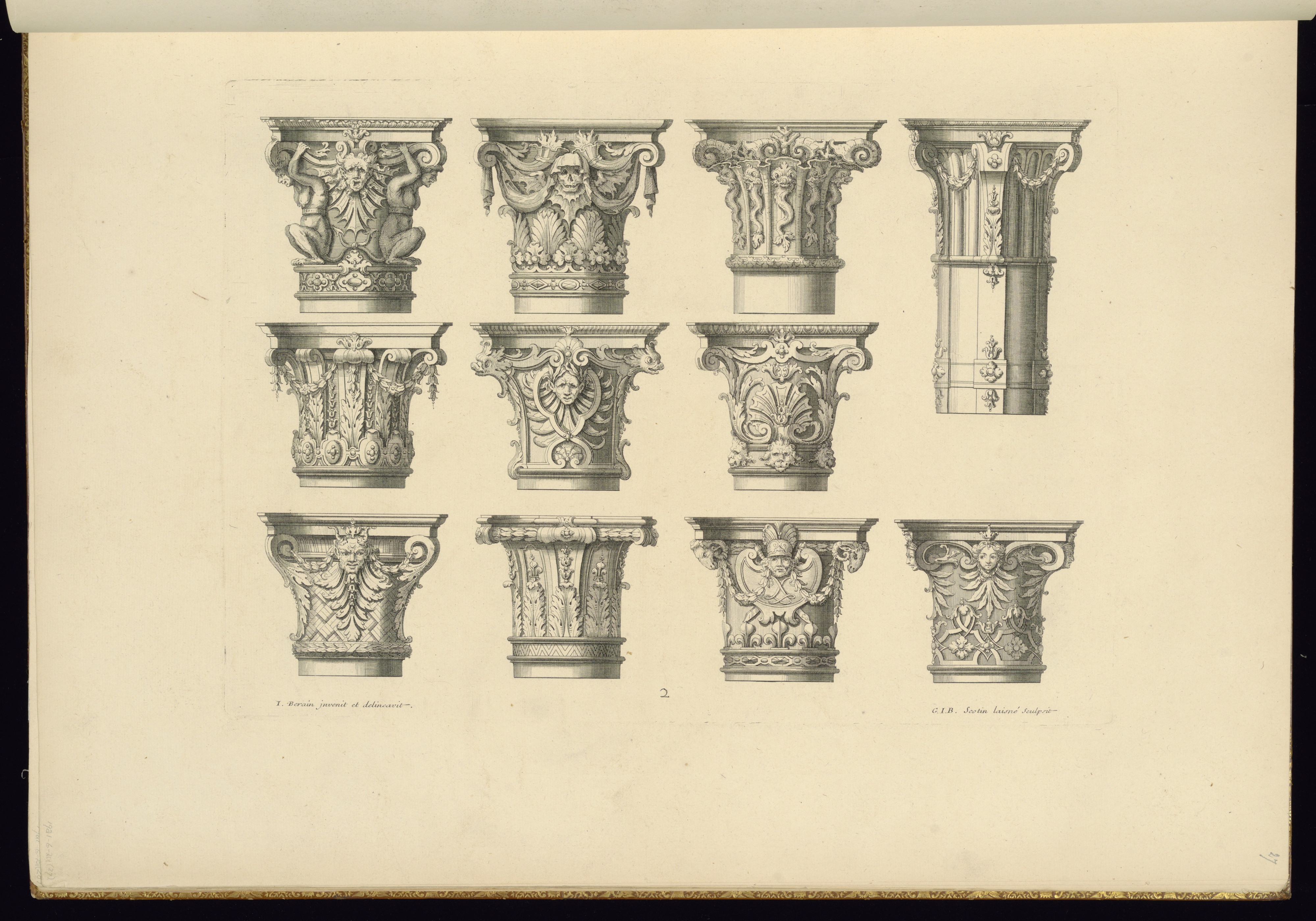 Bound Print, Ornamental Capital Designs; Designed by Jean Bérain the Elder (French, 1640–1711); Print Maker: Gérard Jean-Baptiste Scotin (French, 1671–1716); Published by Jacques Thuret (French, 1669–1738); France; engraving on laid paper; Purchased for the Museum by the Advisory Council; 1921-6-201-27