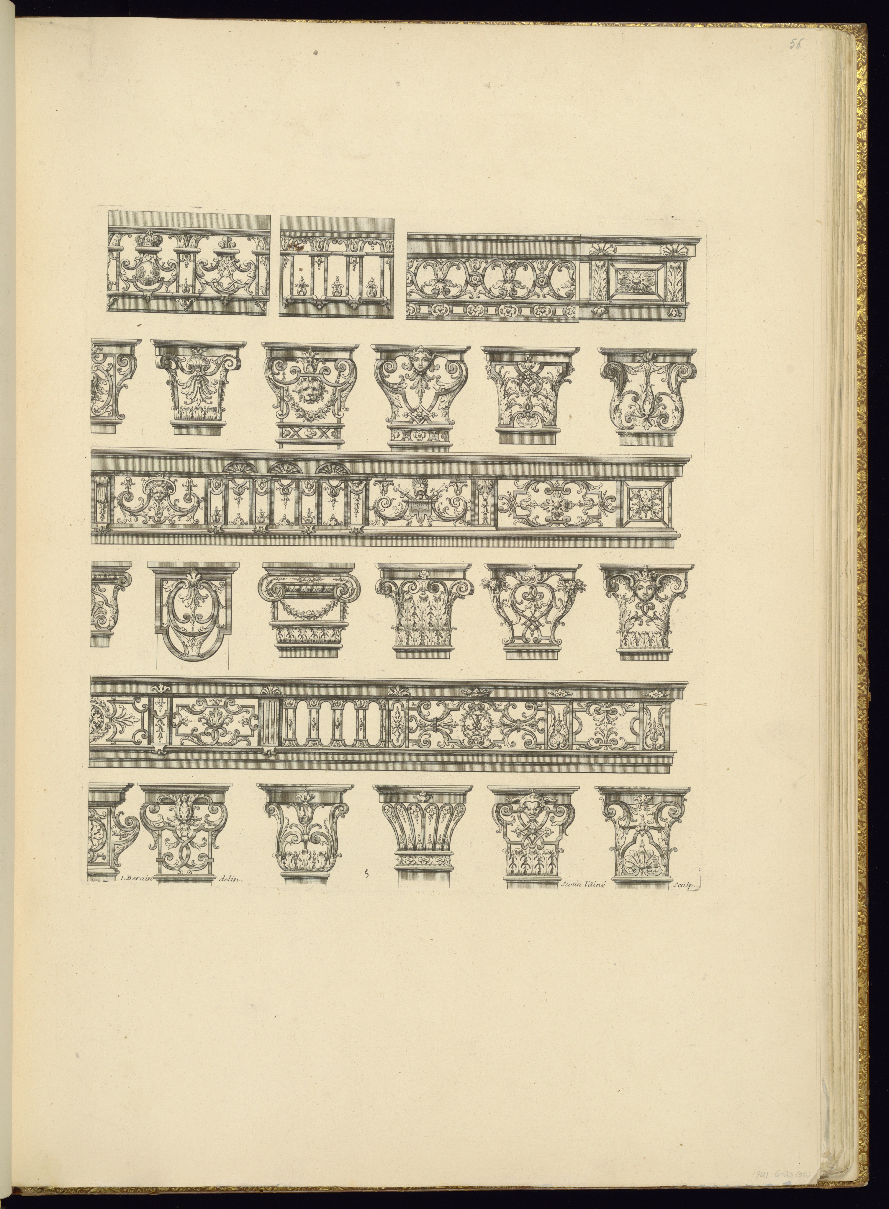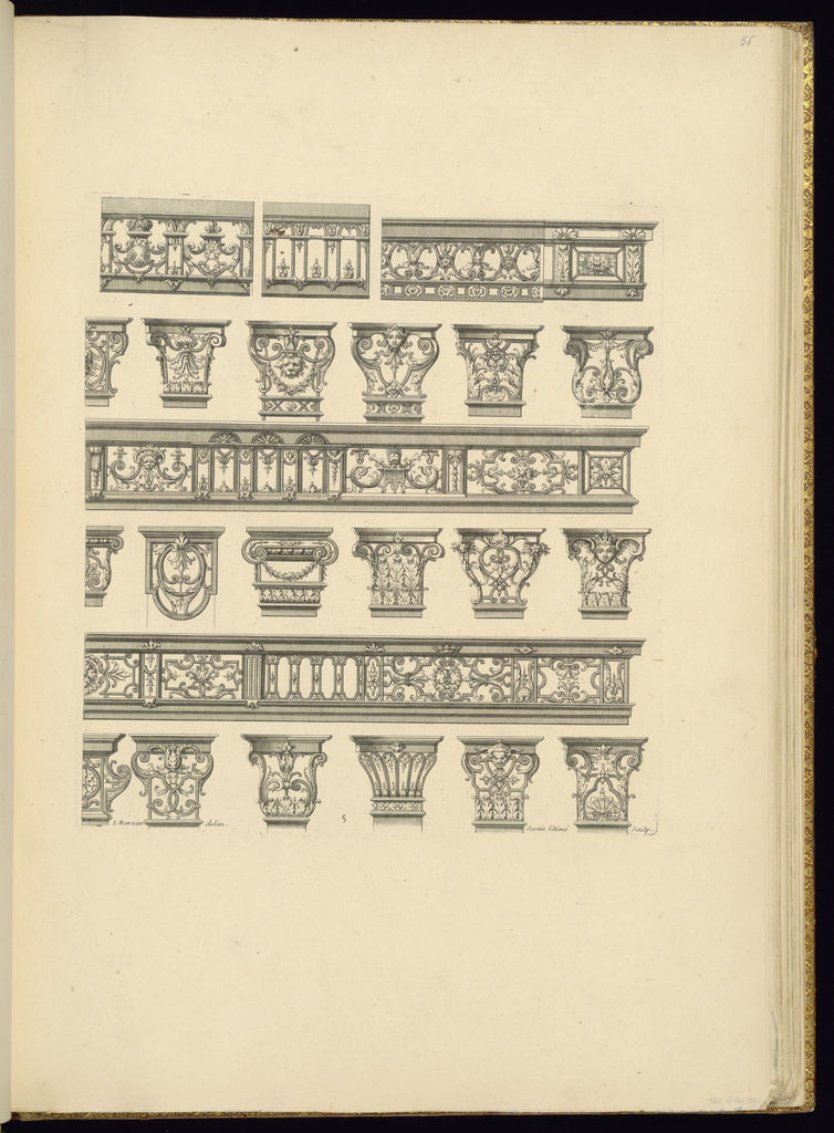 Bound Print, Capital and Balustrade Designs; Designed by Jean Bérain the Elder (French, 1640–1711); Print Maker: Gérard Jean-Baptiste Scotin (French, 1671–1716); Published by Jacques Thuret (French, 1669–1738); France; engraving on laid paper; Purchased for the Museum by the Advisory Council; 1921-6-201-56