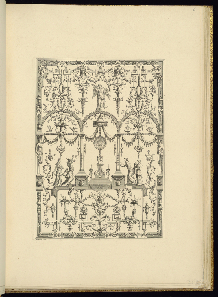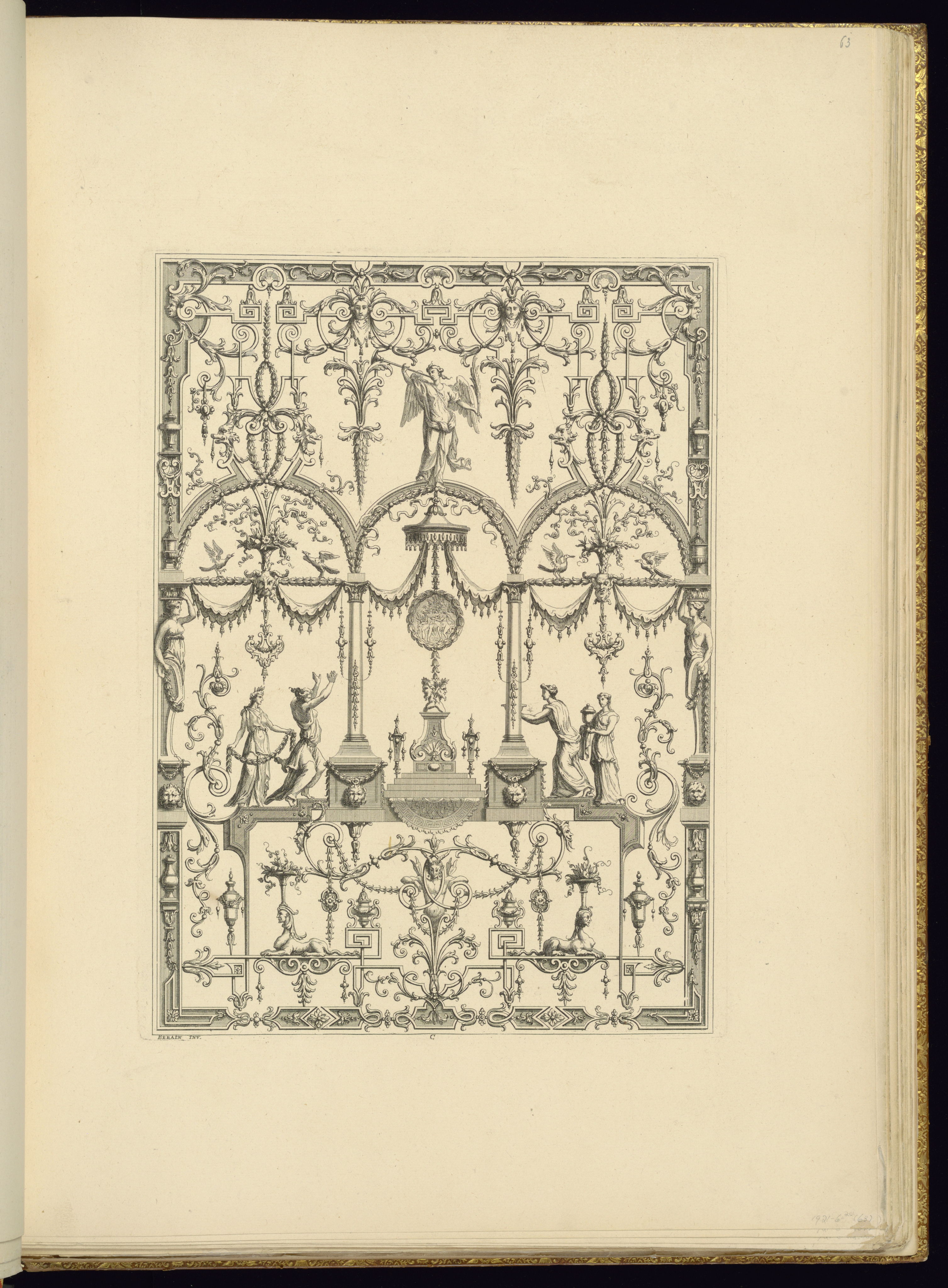 Bound Print, Panel Design of Grotesque Ornamentation; Designed by Jean Bérain the Elder (French, 1640–1711); Published by Jacques Thuret (French, 1669–1738); France; engraving on laid paper; Purchased for the Museum by the Advisory Council; 1921-6-201-63