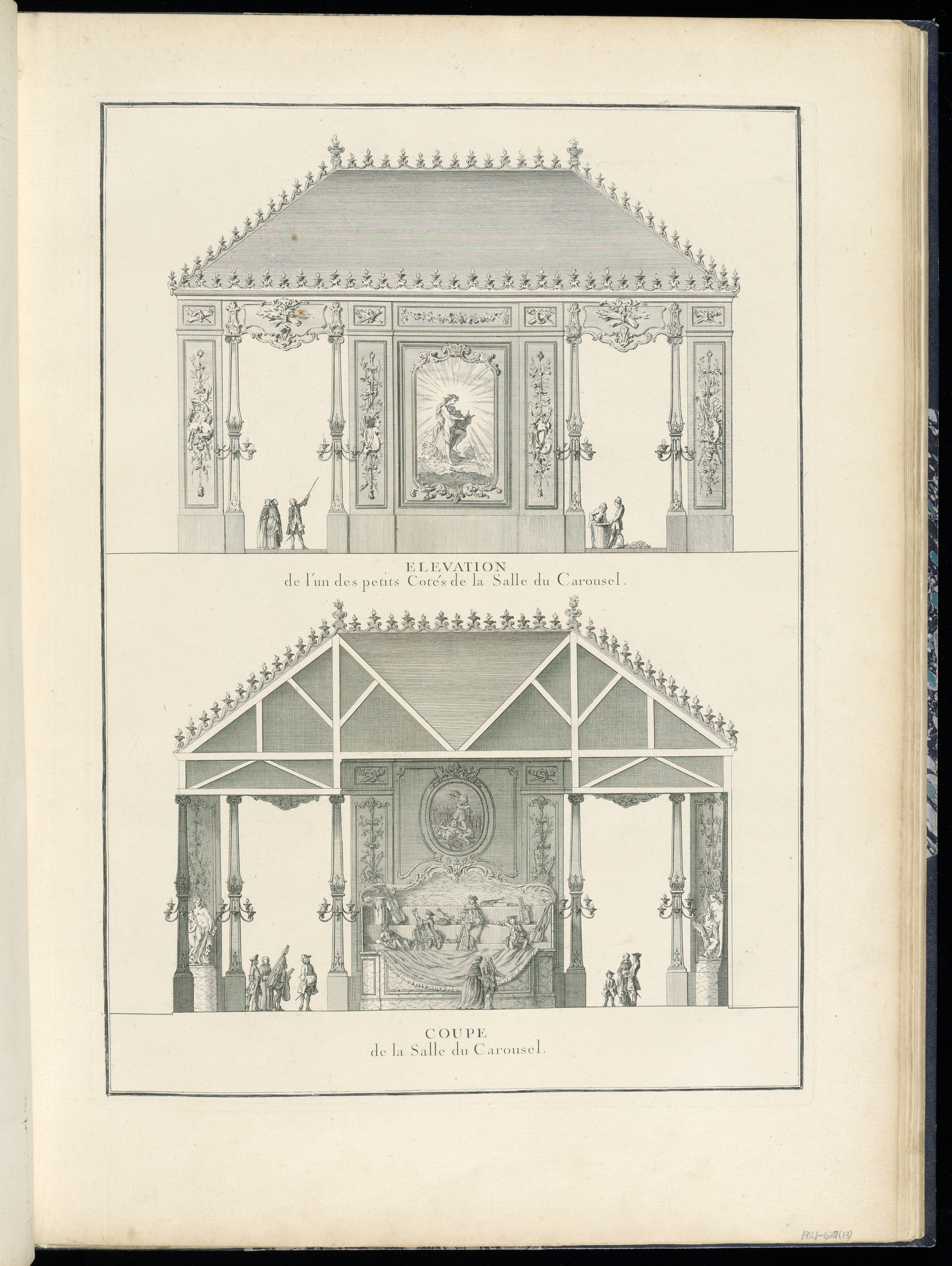 Printed center in plate: ELEVATION / de l'un des petits Cotés de la Salle du Carousel.; Printed lower center, in plate: COUPE / de la Salle du Carousel.; Inscribed in graphite, lower right, in margin: 1921-6-207(13)