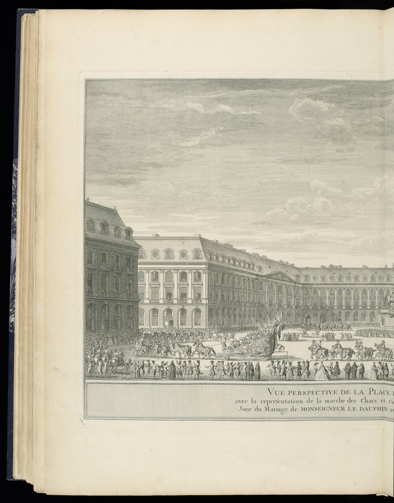 Printed lower center, in plate: VUE PERSPECTIVE DE LA PLACE DE LOUIS LE GRAND / avec la representation de la marche des Chars et Cortége des gardes de la Ville le 13. Fevrier 1747. / Jour du Mariage de MONSEIGNEUR LE DAUPHIN avec la PRINCESSE MARIE JOSEPHE DE SAVE.