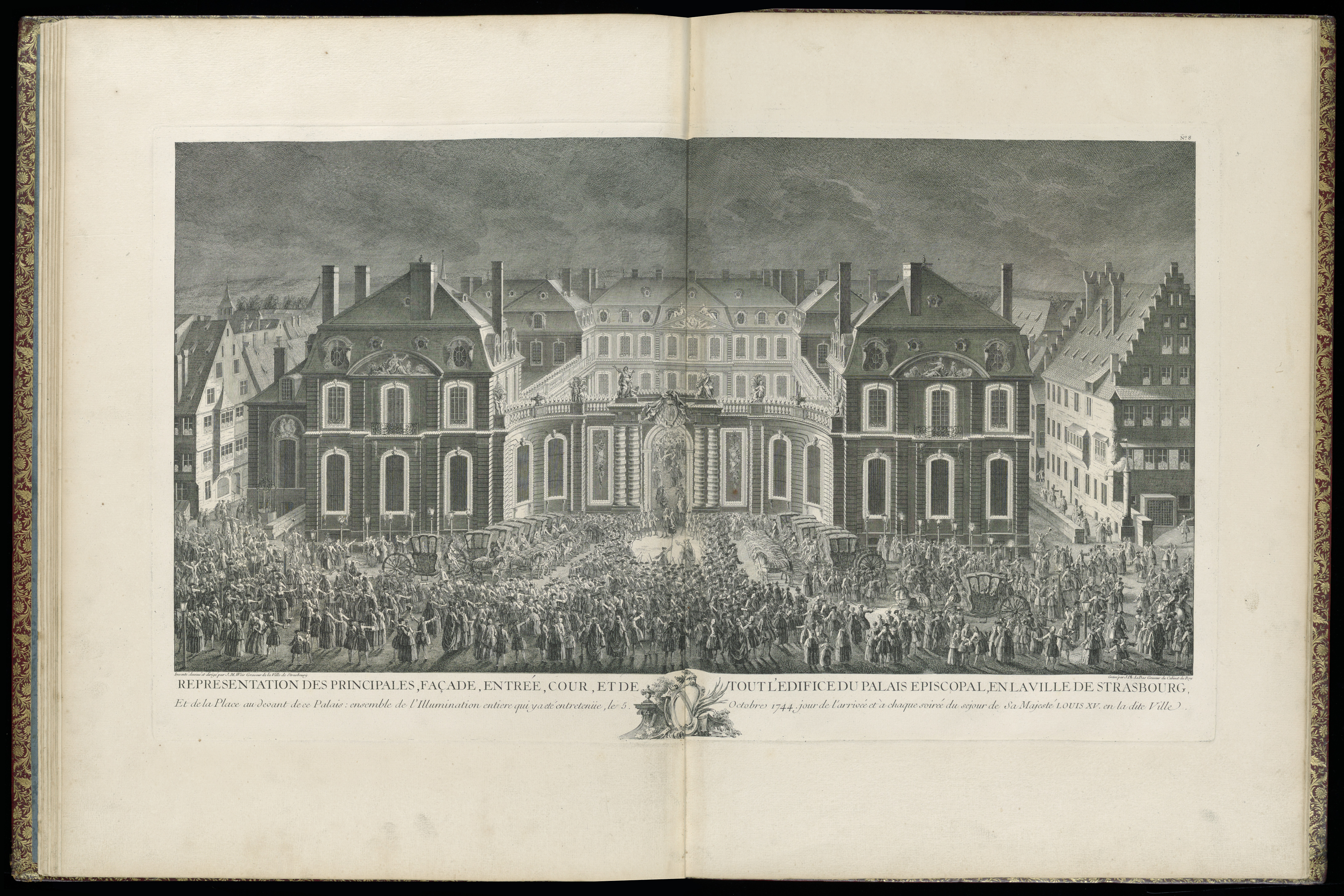 Lettered in plate, lower center : REPRESENTATION DES PRINCIPALES, FAÇADE, ENTRÉE, COUR, ET DE TOUT L’EDIFICE DU PALAIS EPISCOPAL, EN LE VILLE DE STRASBOURG / Et de la Place au devant de ce Palais: ensemble de l’Illumination entiere qui ya eté entretenüe, le 5. Octobre 1744. jour de l’arrivée et à chaque soirée du sejour de Sa Majesté LOUIS XV. en la dite Ville.; numbered upper right : No. 8