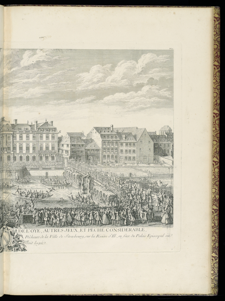 Inscribed in plate, lower center: RÉPRÉSENTATION DES JOUTES, EXERCICES DE LA BAGUE, DE L’OYE, AUTRES JEUX, ET PÊCHE CONSIDÉRABLE / Le tout executé en présence de Sa Majesté Louis XV. les 7° et 8° Octobre 1744. par les Bateliers et Pêcheurs de la Ville de Strasbourg, sur la Riviére d’Ill, en façe du Palais Episcopal où / Sa Majesté étoit logée.; numbered upper right : No.10