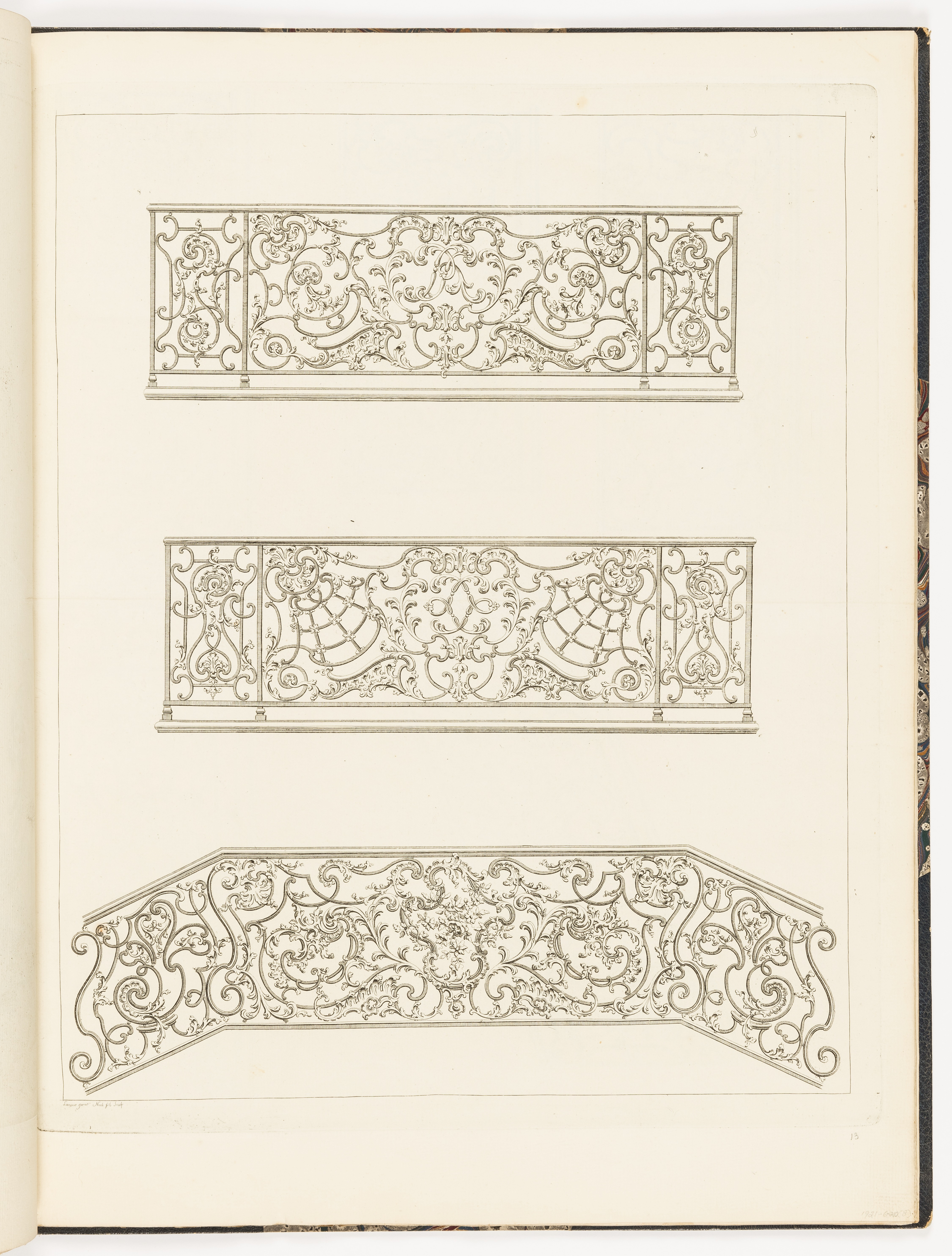 Print, Three Designs for Balustrades; Designed by Jean Lamour; Print Maker: Claude Francois Nicole (French, ca. 1700 – ca. 1783); France; etching and engraving on laid paper; Sheet: 61 x 45.7 cm (24 x 18 in.) Platemark: 53.3 x 43.2 cm (21 x 17 in.); Purchased for the Museum by the Advisory Council; 1921-6-210-8