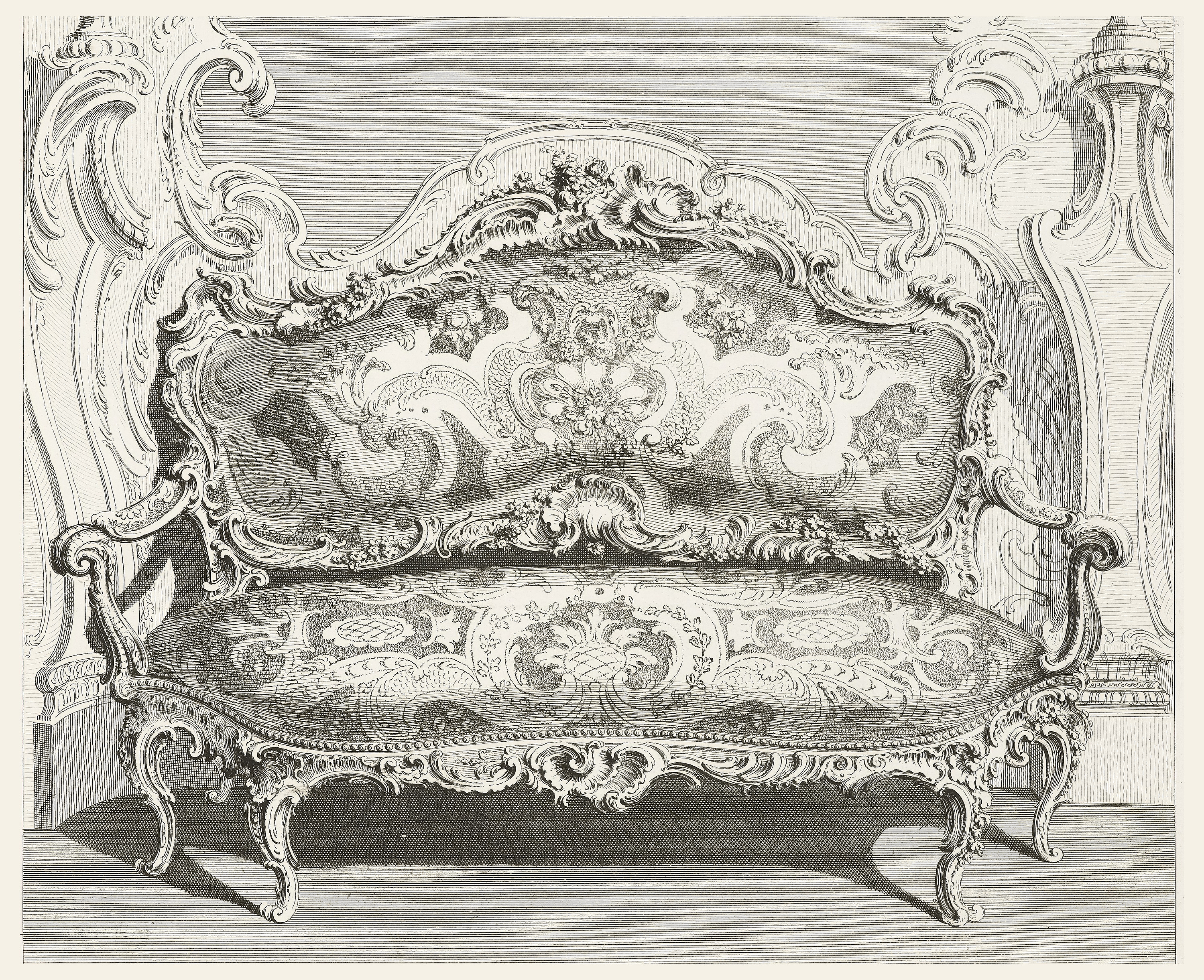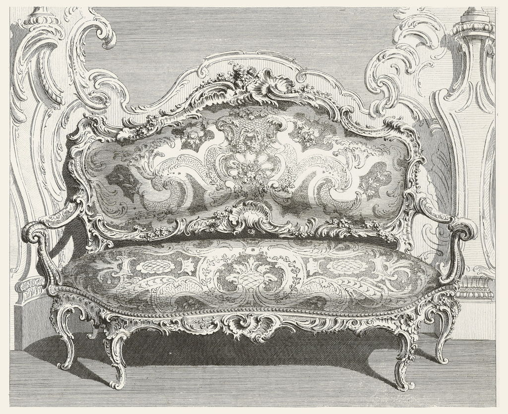 Inscribed on plate, upper left: Q; upper right: 94; lower left: J.A. Meissonnier, inv.; lower center: Canapé executé pour Mr. le Comte de Bielinski Grand M.al de la Couronne de Pologne, en 1735./A Paris chés Huquier ruë St. Jacques au coin de celle des Mathurins C.P.R.; lower right, Huquier Sculp.
