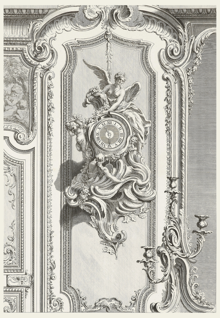 Print, Projet d'une grande Pendule placée sur un paneau (Design for a Pendulum Clock Placed on a Panel), plate 97, in Oeuvres de Juste-Aurèle Meissonnier (Works by Juste-Aurèle Meissonnier); Designed by Juste-Aurèle Meissonnier (French, b. Italy, 1695–1750); Engraved by Gabriel Huquier (French, 1695–1772); France; engraving on laid paper; 48.1 x 33.4 cm (18 15/16 x 13 1/8 in.); Purchased for the Museum by the Advisory Council; 1921-6-212-55