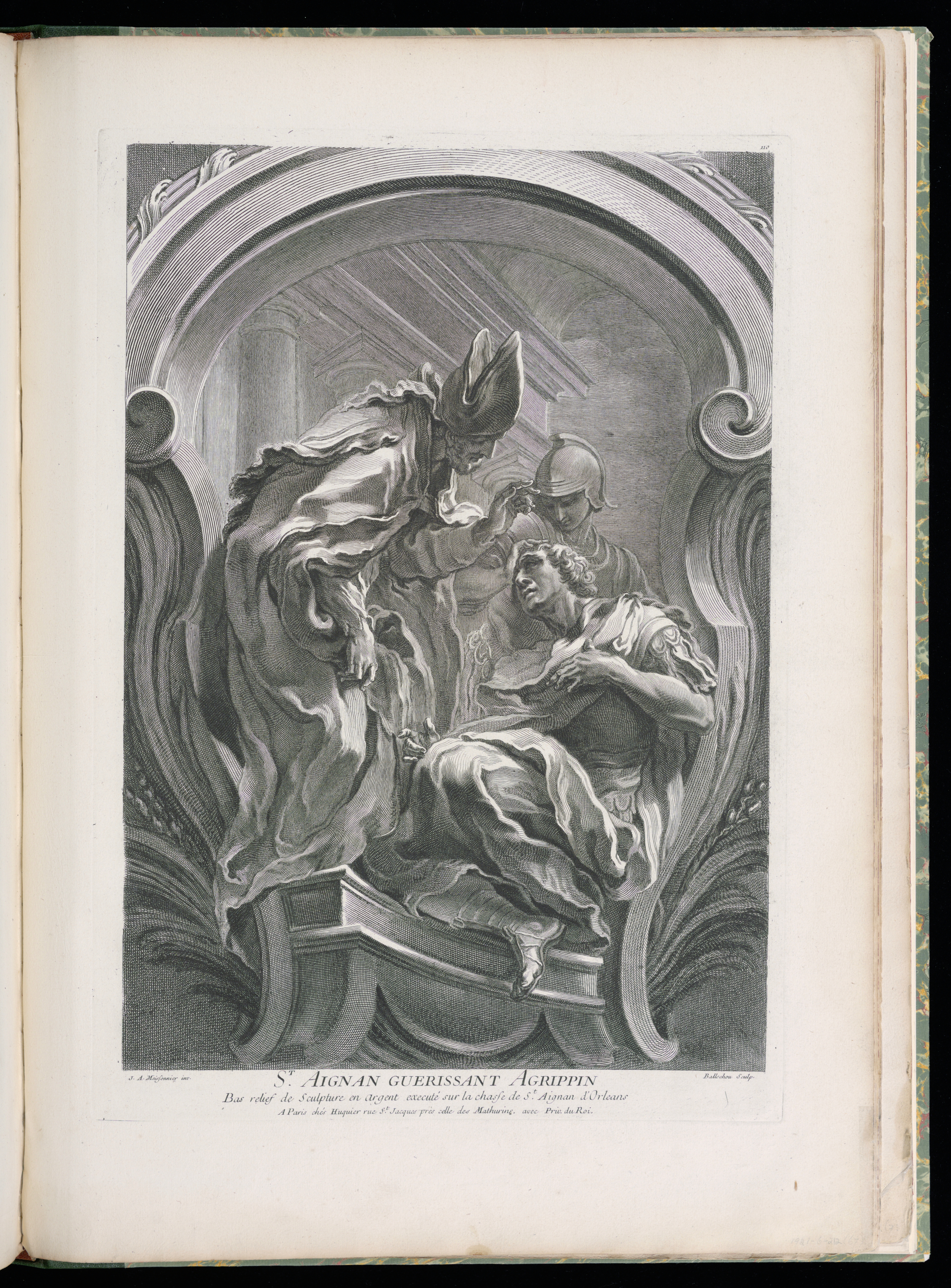 Inscribed in plate, upper right: 110; lower center: ST. AIGNAN GUERISSANT AGRIPPIN / Bas relief de Sculpture en argent executé sur la chasse de St. Aignan d'Orleans / A Paris chés Huquier rue St. Jacques au coin de celle des Mathurins. avec Priv. du Roi.