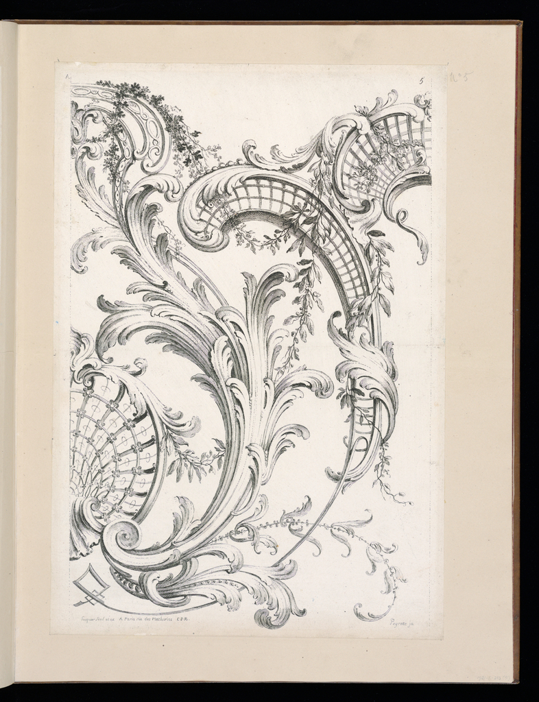 Print, Acanthus Leaf and Fretwork Ornament Design; Designed by Alexis Peyrotte (French, 1699–1769); Print Maker: Gabriel Huquier (French, 1695–1772); France; etching on laid paper; 47.8 x 32.7 cm (18 13/16 x 12 7/8 in.); Purchased for the Museum by the Advisory Council; 1921-6-213-5