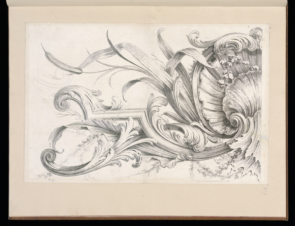 Bound Print, Shell Ornament Design; Designed by Alexis Peyrotte (French, 1699–1769); Print Maker: Gabriel Huquier (French, 1695–1772); France; etching on laid paper; Sheet: 47.6 x 32.7 cm (18 3/4 x 12 7/8 in.); Purchased for the Museum by the Advisory Council; 1921-6-213-9