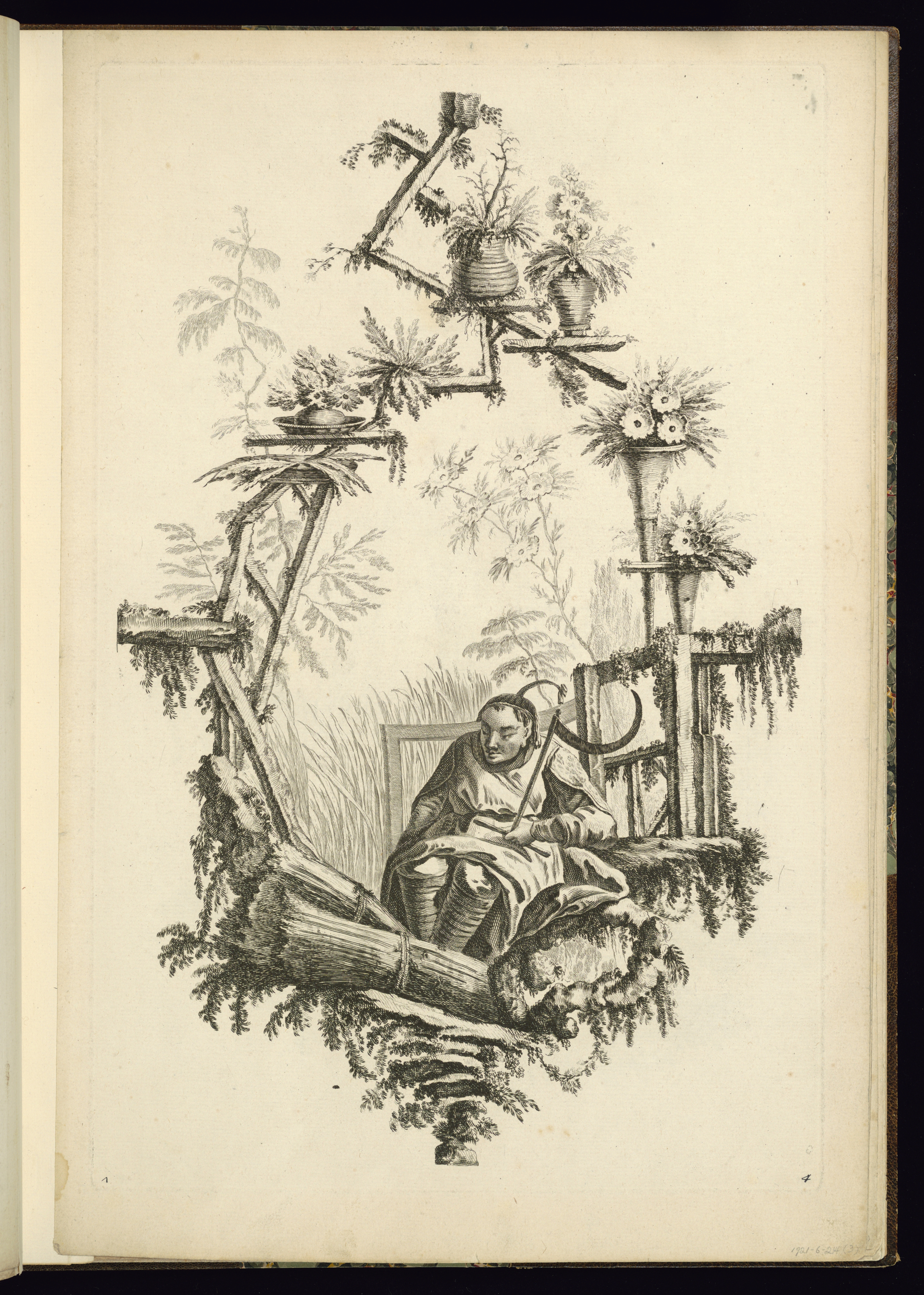 Bound Print, Man Holding a Sickle; Designed by Jean-Baptiste Pillement (French, 1728–1808); Print Maker: Pierre-Charles Canot (French, 1710 - 1777); France; etching on laid paper; Purchased for the Museum by the Advisory Council; 1921-6-214-3