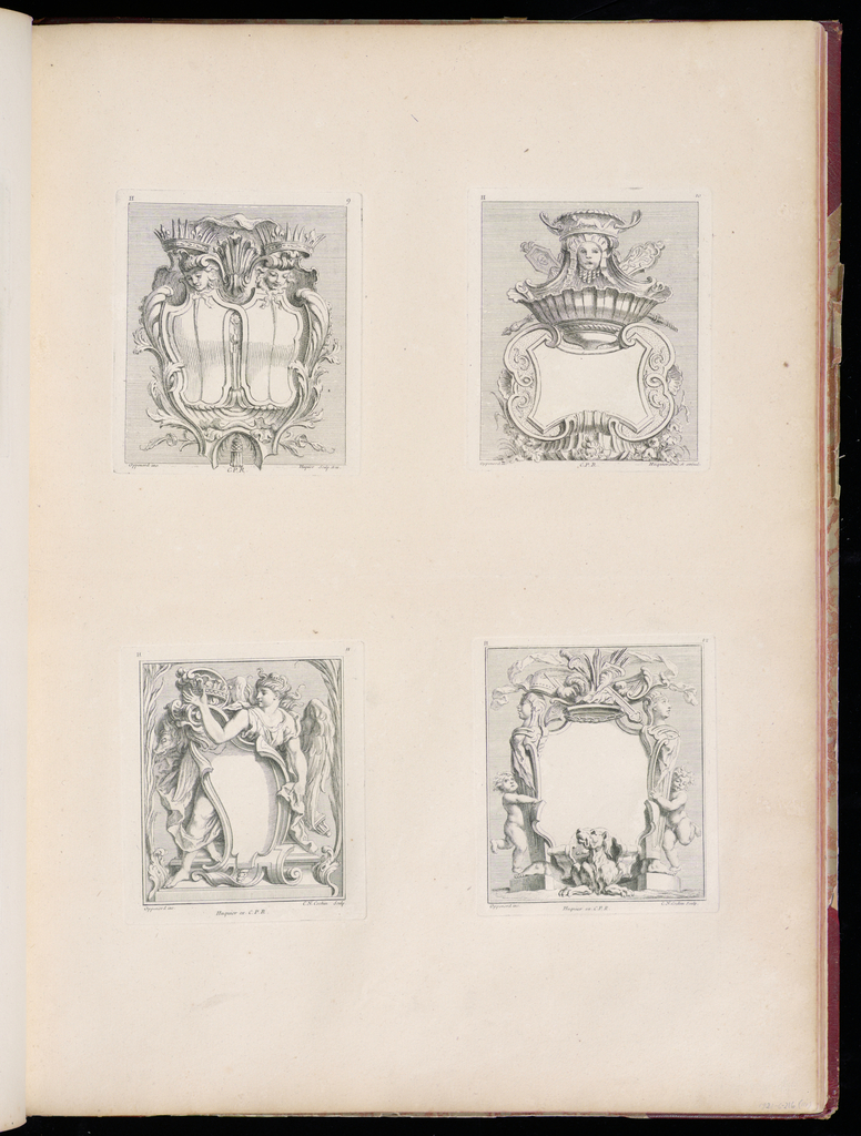 Bound Print, Designs for Cartouches; Designed by Gilles-Marie Oppenord (French, 1672–1742); Print Maker: Gabriel Huquier (French, 1695–1772), Charles-Nicolas Cochin the elder (French, 1688 - 1754); Published by Chez Huquier; France; etching and engraving on laid paper; Purchased for the Museum by the Advisory Council; 1921-6-216-111