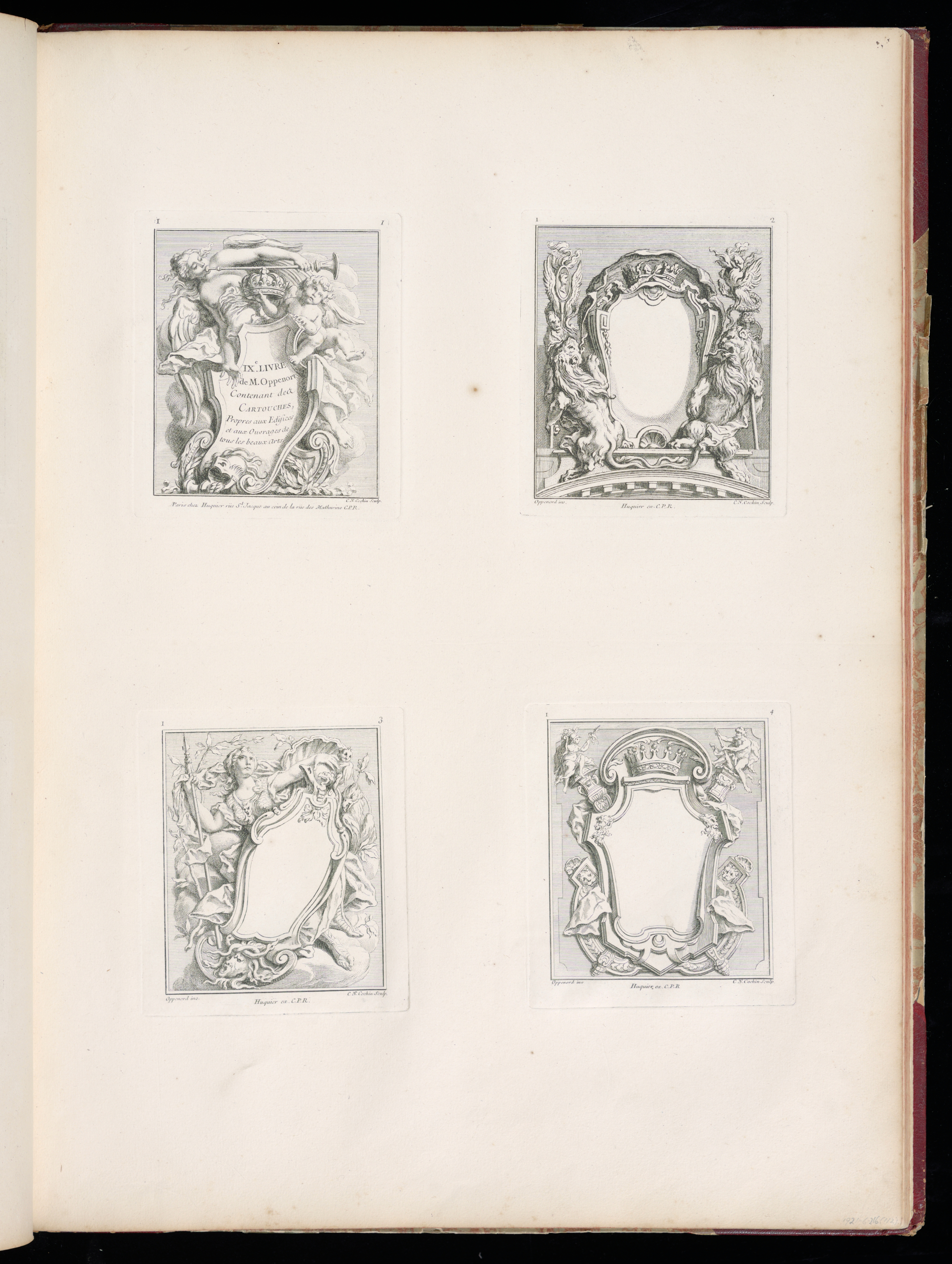 Upper Left Plate: Printed upper left, in plate: I; Printed upper right, in plate: 1; Printed center, in plate: IXe. LIVRE / de M. Oppenort / Contenant des / CARTOUCHES, / Propres aux Edifices / et aux Ouvrages de / tous les beaux Arts; Printed lower center, in plate: AParis chez Huquier rüe St.Jacque au coin de la rüe des Mathurins C.P.R. Upper Right Plate: Printed upper left, in plate: I; Printed upper right, in plate: 2; Printed lower center, in plate: Huquier ex.C.P.R. Upper Right Plate: Printed upper left, in plate: I; Printed upper right, in plate: 3; Printed lower center, in plate: Huquier ex.C.P.R. Upper Right Plate: Printed upper left, in plate: I; Printed upper right, in plate: 4; Printed lower center, in plate: Huquier ex.C.P.R. Inscribed in graphite, lower right, in margin: 1921-6-216(112)
